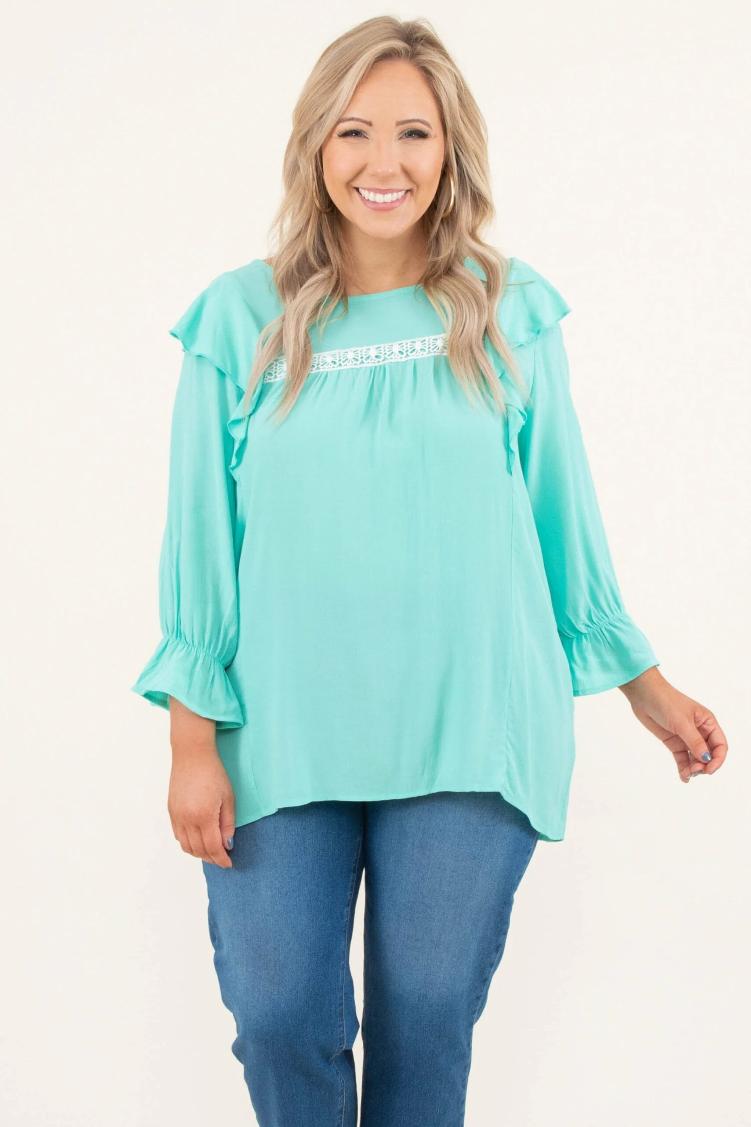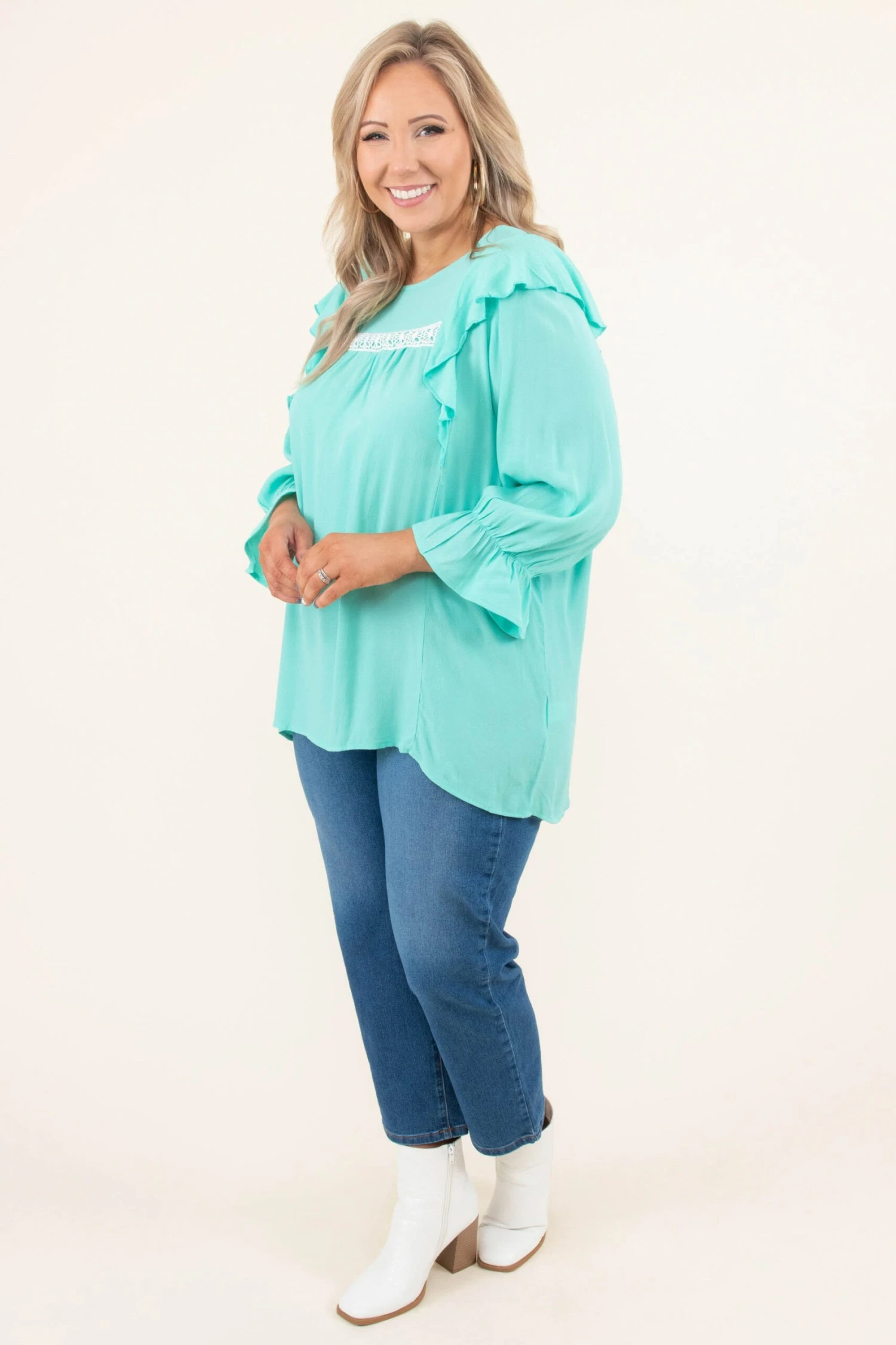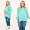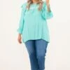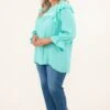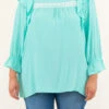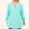Make a bold statement with this fun top this season! The bright mint color is so fun and the white trim and ruffle details at the neck are so pretty! Pair this cutie with skinnies and your fave wedges for a super stylish look!