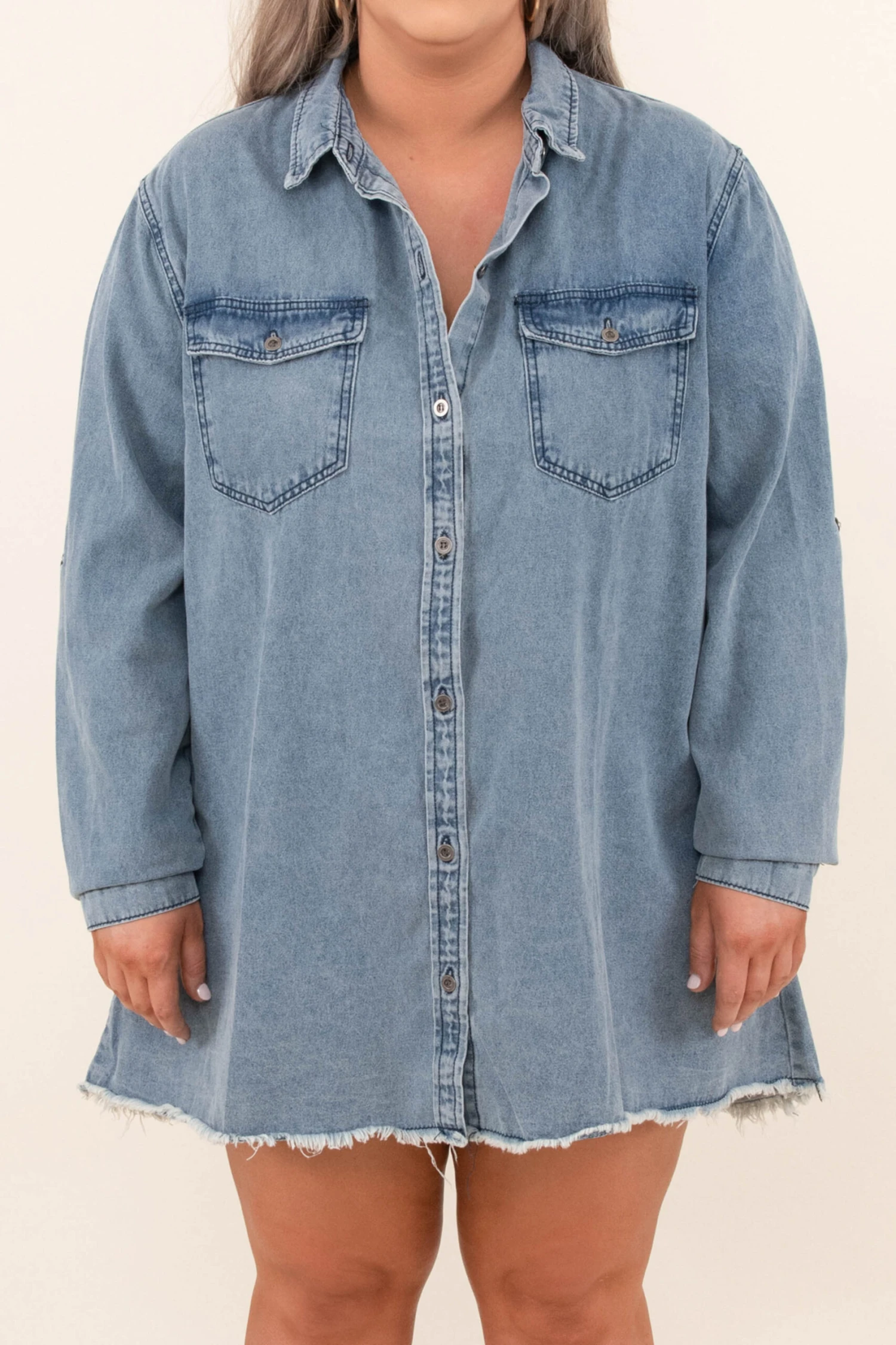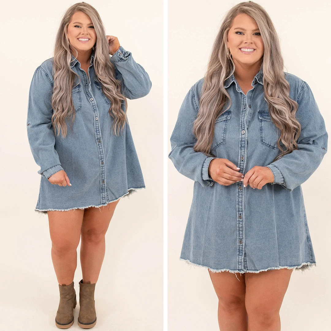 This dress is so comfortable you’ll never want to let it go! It is easily one of our favorites, the frayed hemline makes this dress so chic! This dress is also extremely versatile and can be worn as a dress or button-down with jeans and a solid top! Dress it up with booties for an effortlessly beautiful look!