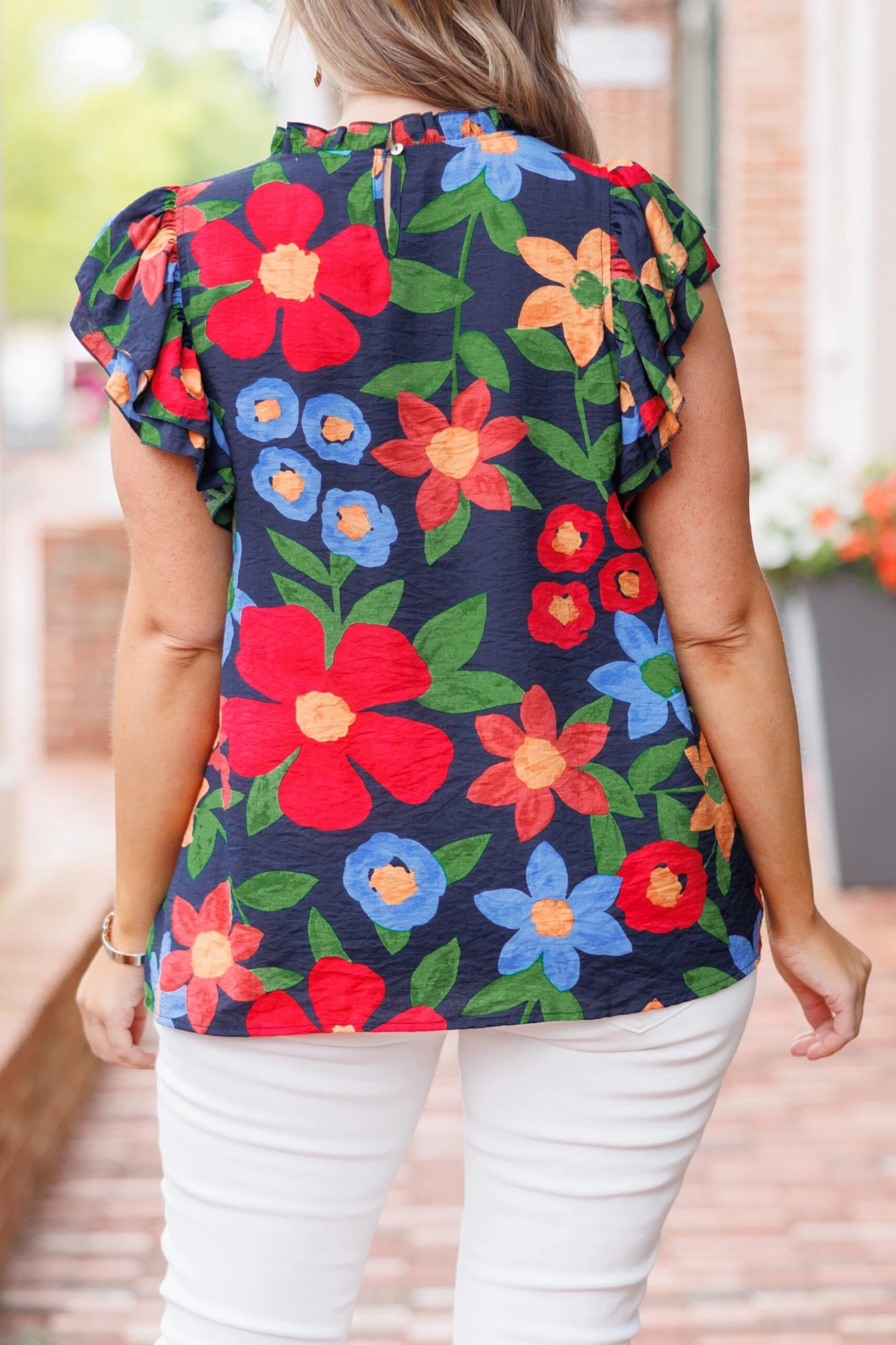 Stay cool and comfortable in this dazzling top! This beautiful design features a delicate floral pattern, a classic navy hue, and flutter sleeves! Perfect for any summer occasion, this top will keep you looking and feeling your best!