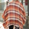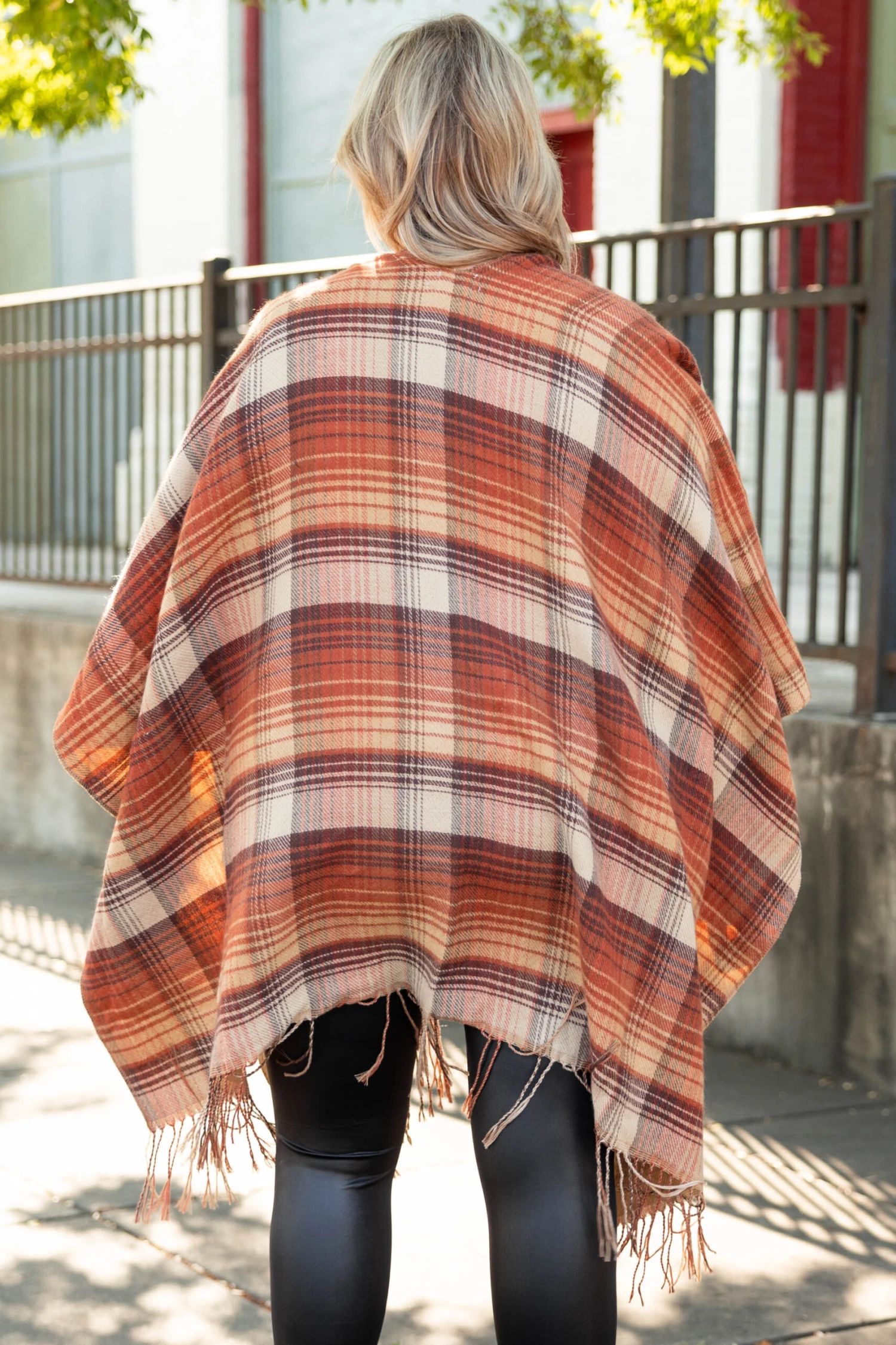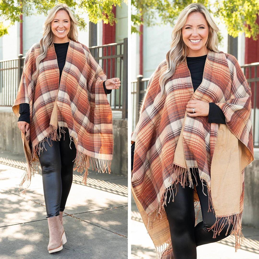 This poncho will make them stare and whisper how cute it is! The rust color and plaid pattern is perfect to match with all your favorite outfits! This babe is lightweight and the fabric is so soft! Style this with some skinnies and a cute top or flirty dress for a classically, chic look!