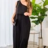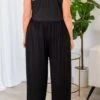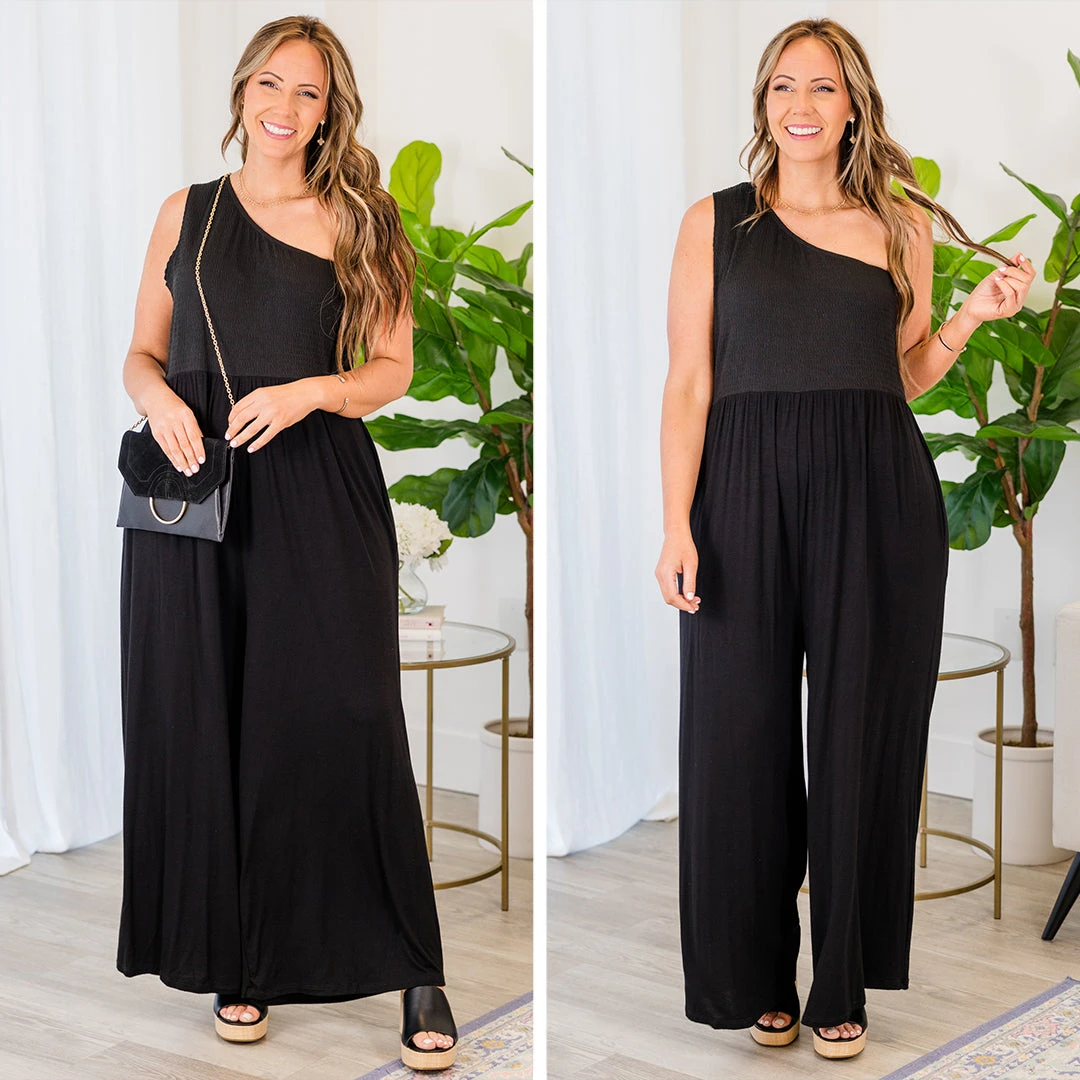 You’ll hear whispers of your beauty in this gorgeous jumpsuit! It is perfect for a night out with its flirty fit and functional one shoulder design! The neutral black color complements any wardrobe and the addition of pockets adds convenience to both style and function!Â