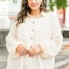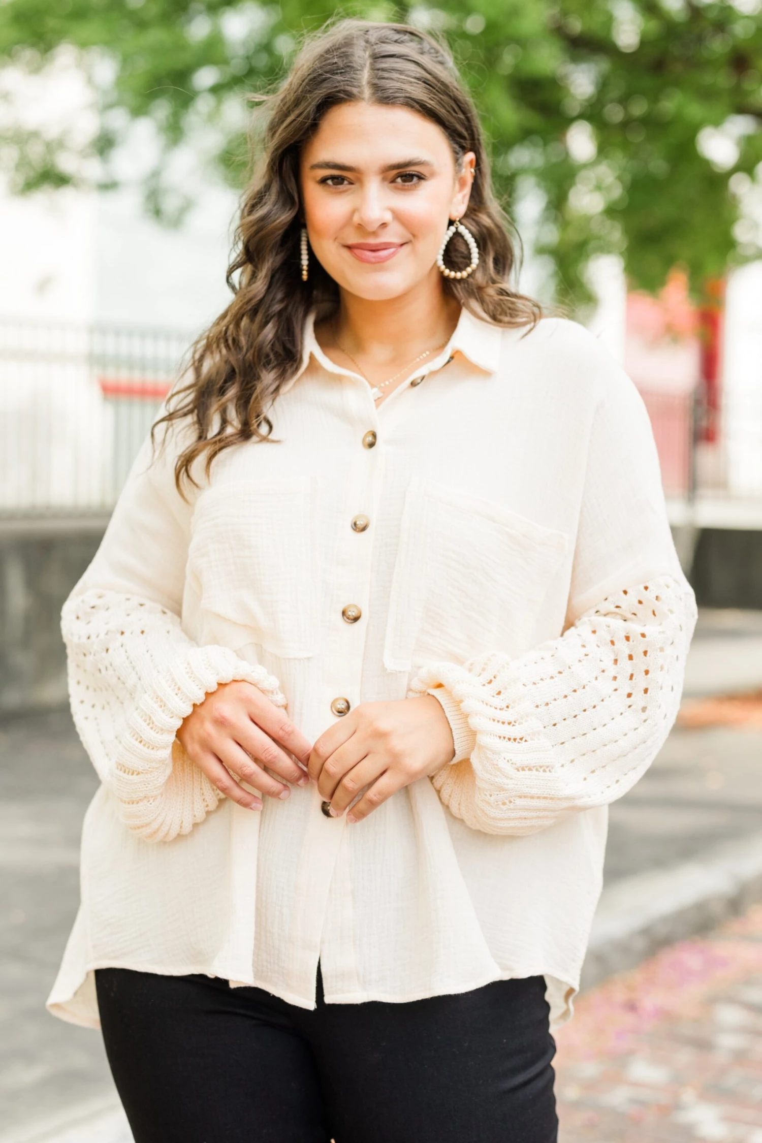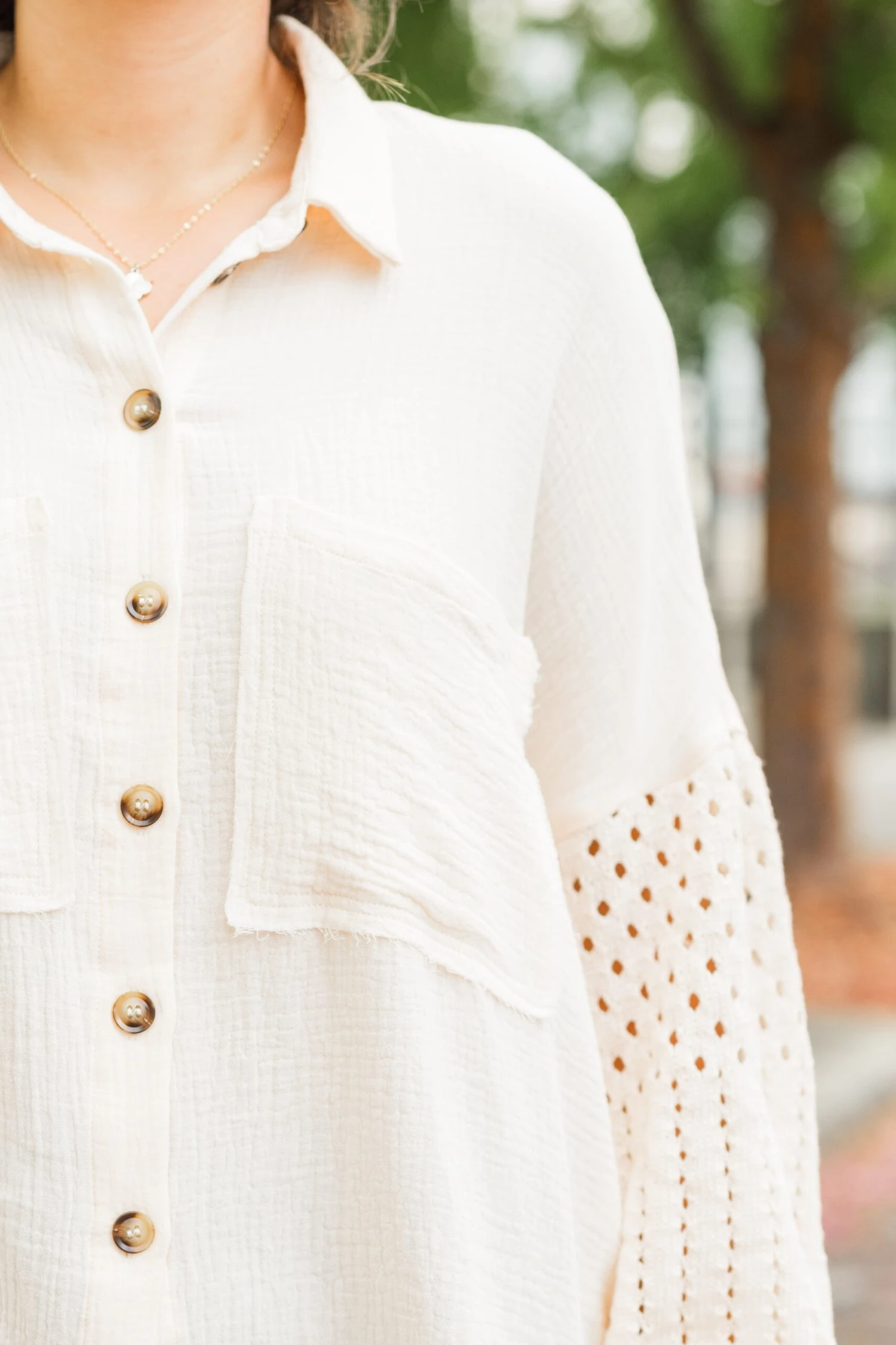 Stay comfortable and chic in our Whispering Petals Top! Made with gauze material and crochet contrast sleeves, this versatile piece can be worn as a top or shacket for any occasion! Pair it with leggings or denim and booties for an effortlessly stylish look!