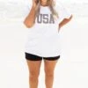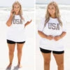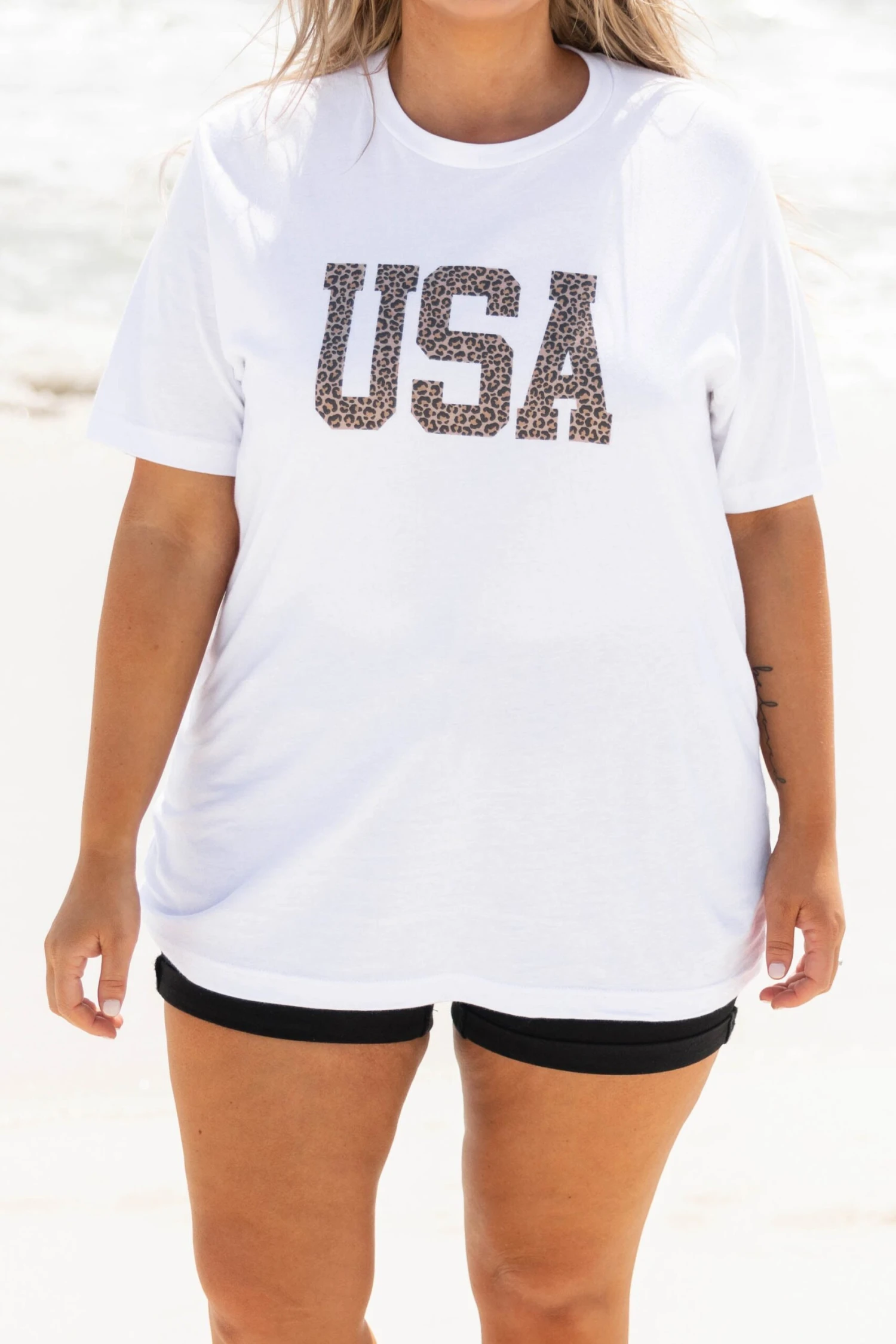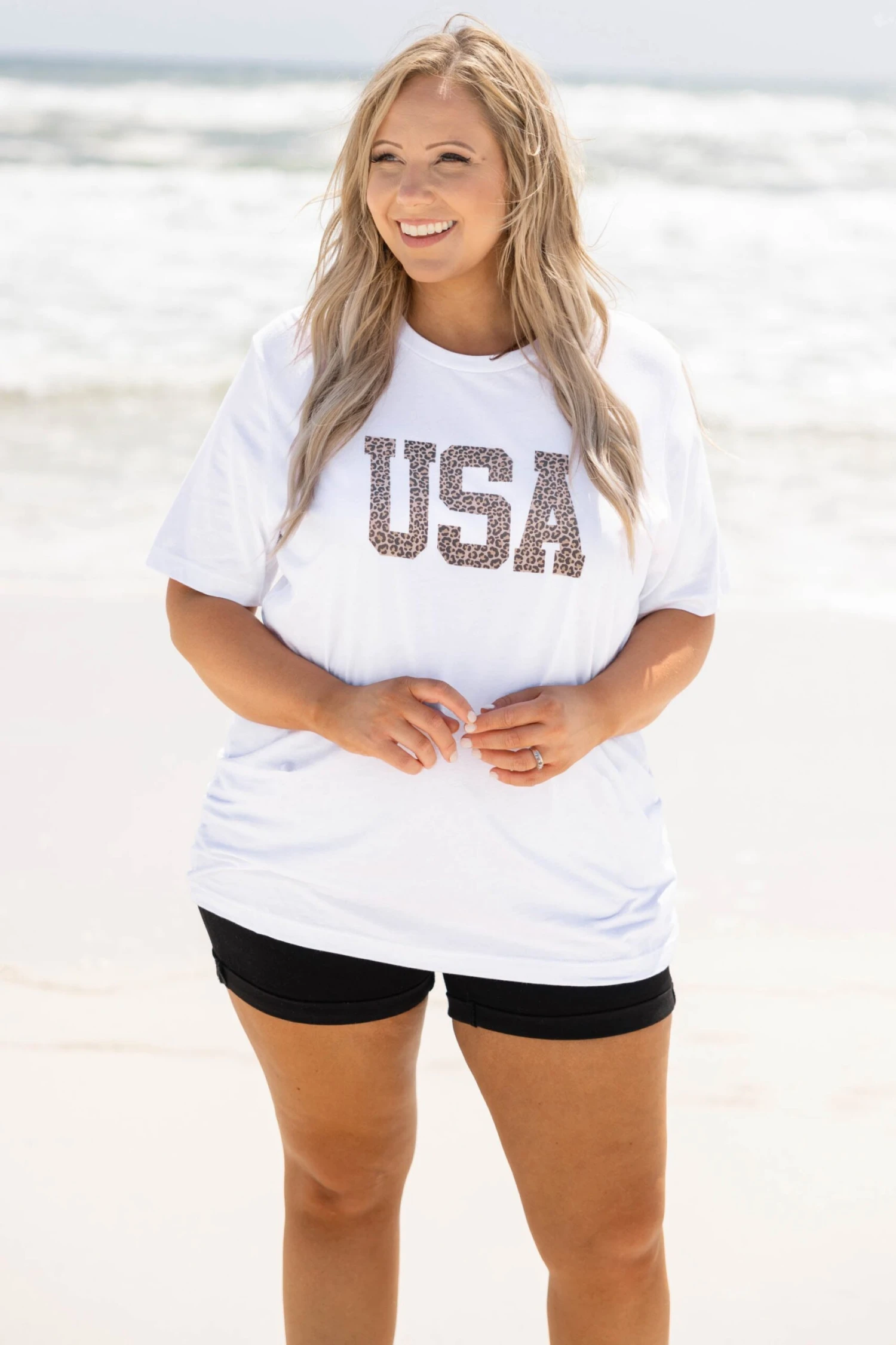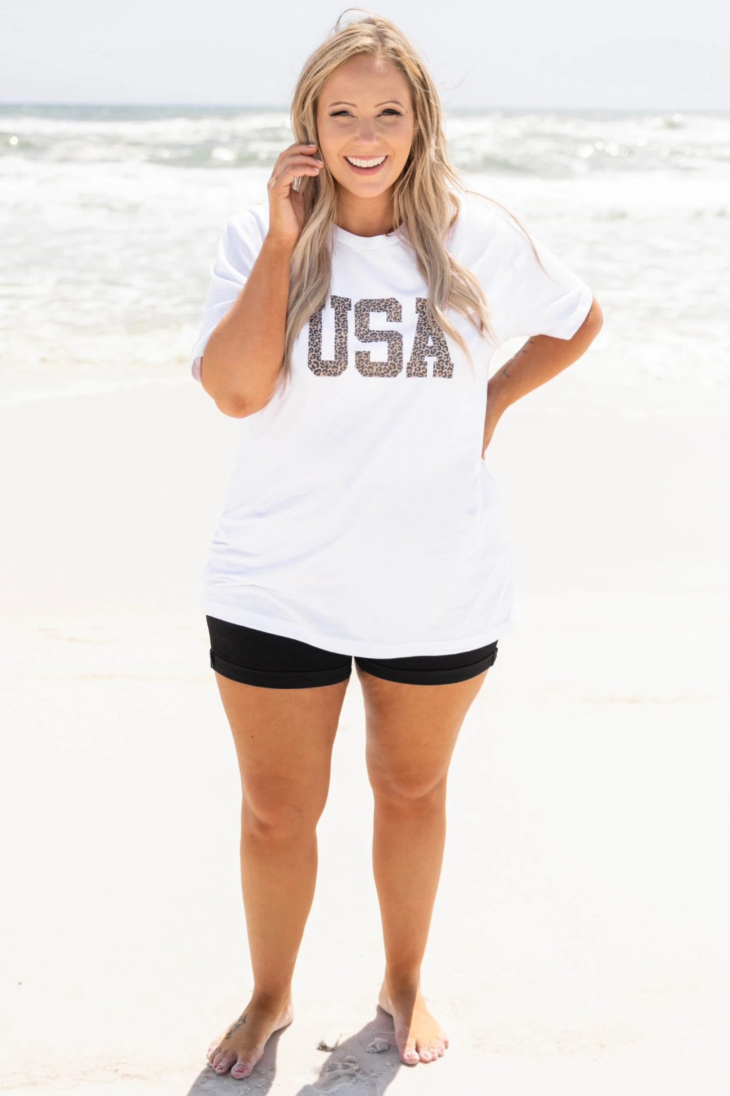 We are wild about the USA and this tee is perfect for showing it off! The leopard pattern USA graphic is so sassy and the tee style is so comfy! Style this with black shorts and sandals for a totally chic look!