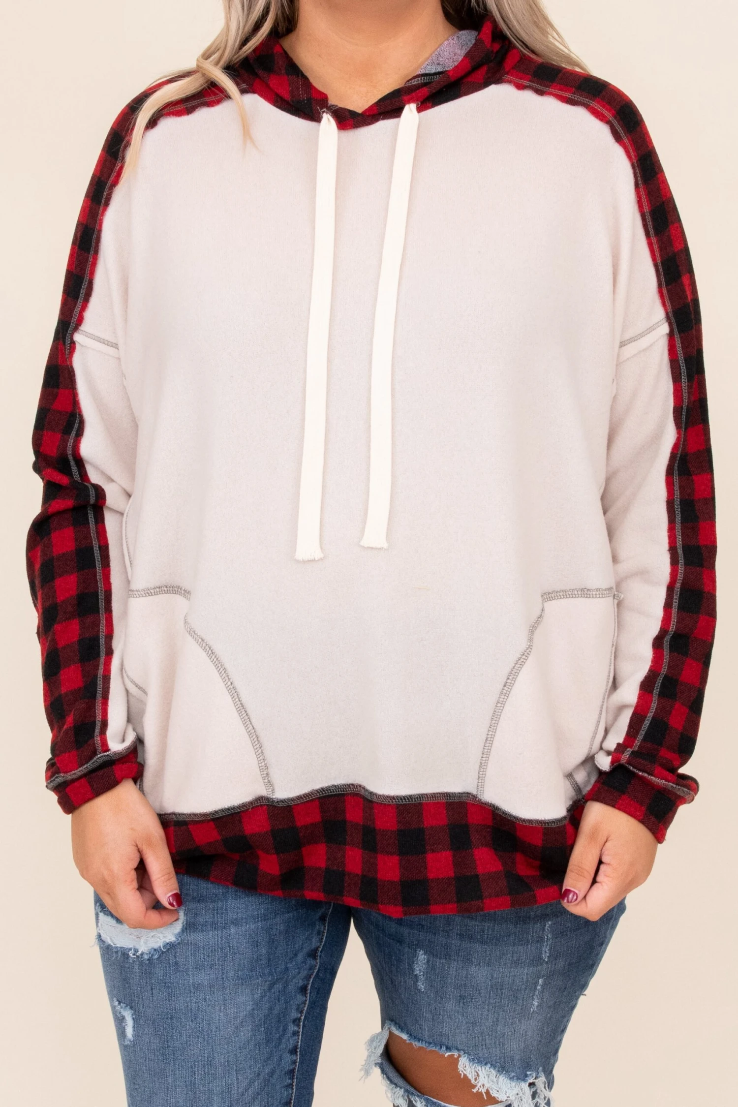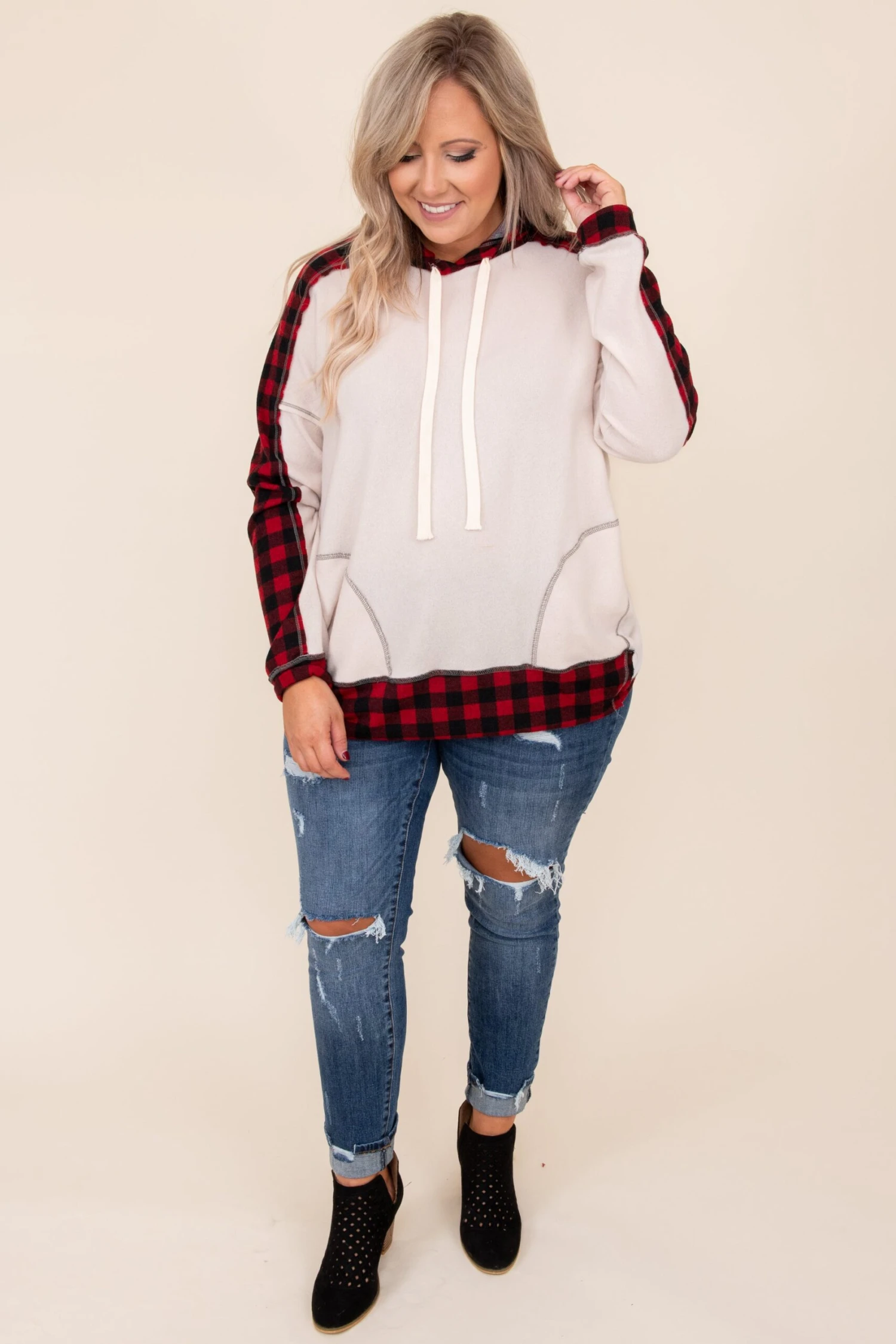 We’ve got a few wild cards up our sleeve and this might just be one of them! This top is so chic and features your favorite pattern: buffalo plaid! This top is so soft and cozy, comfortable for all day wear and even has a hood! This top can do no wrong when it comes to styling with all of your favorites! Pair this top with a pair of distressed denim and booties for a chic, on-the-go look!