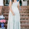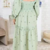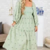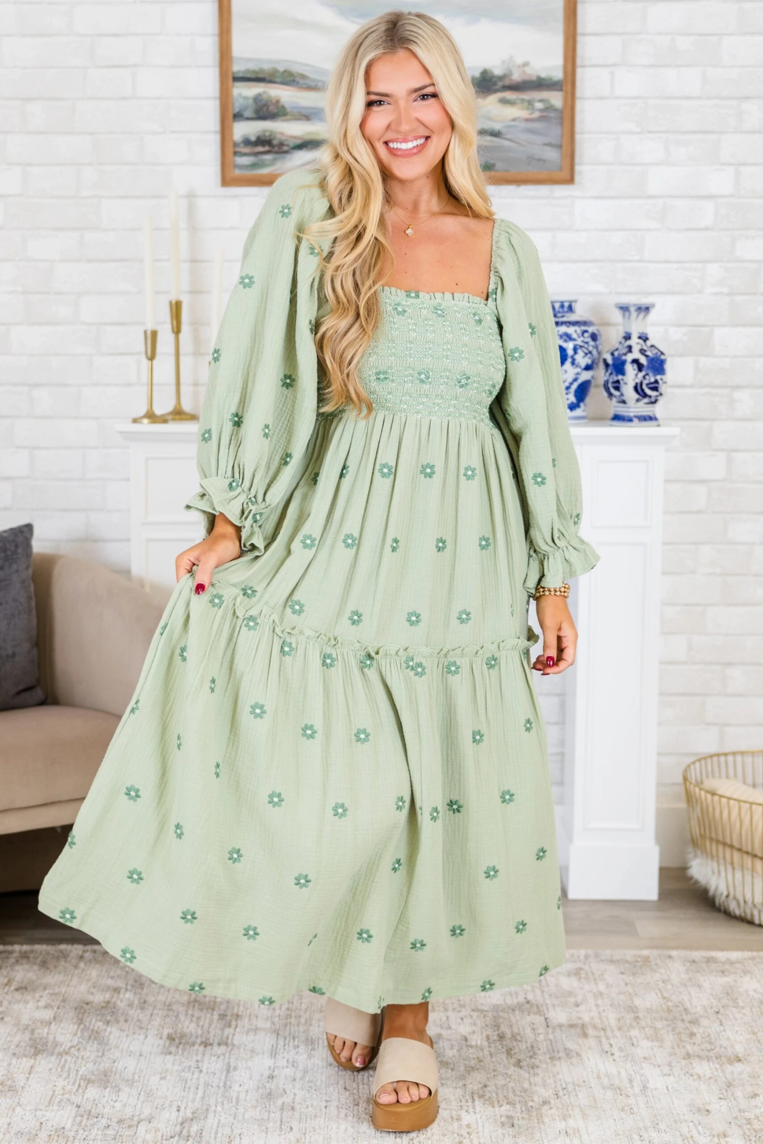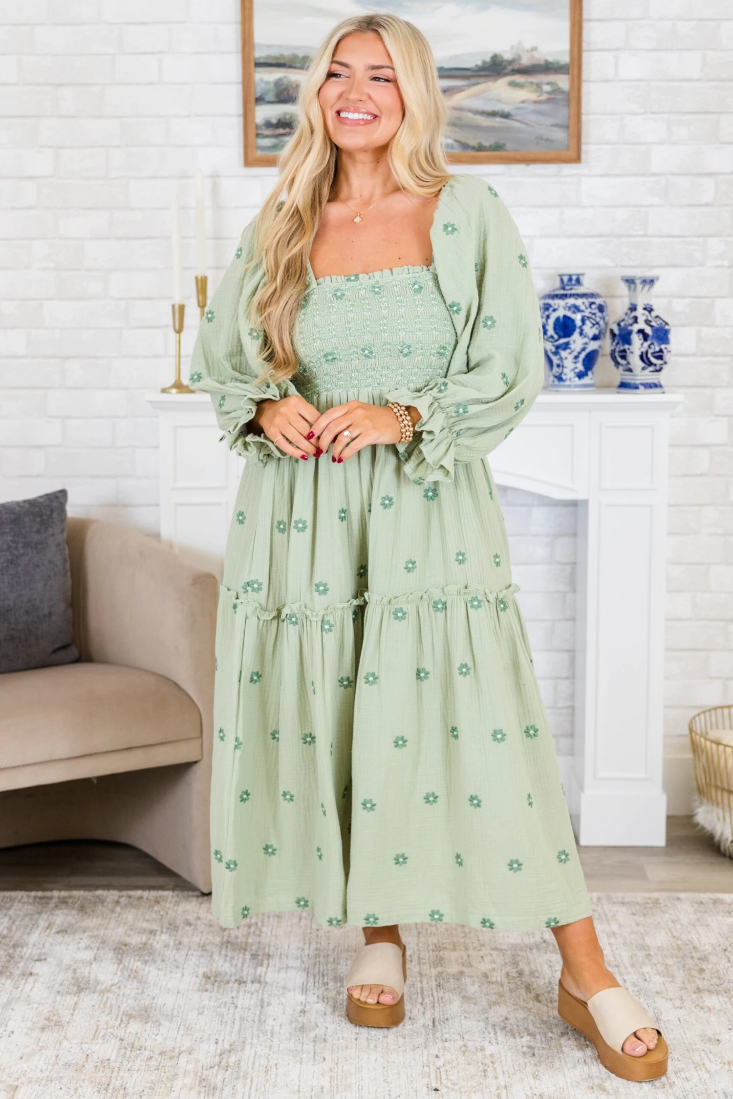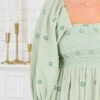 Indulge in the enchanting Wildflower Wonder Dress in green! Featuring a smocked bust and delicate floral embroidery, this dress exudes elegance! The classic square neckline and elastic ruffle cuffs add a touch of sophistication! Elevate your look with this exclusive piece!