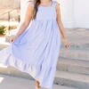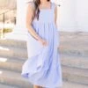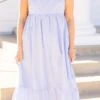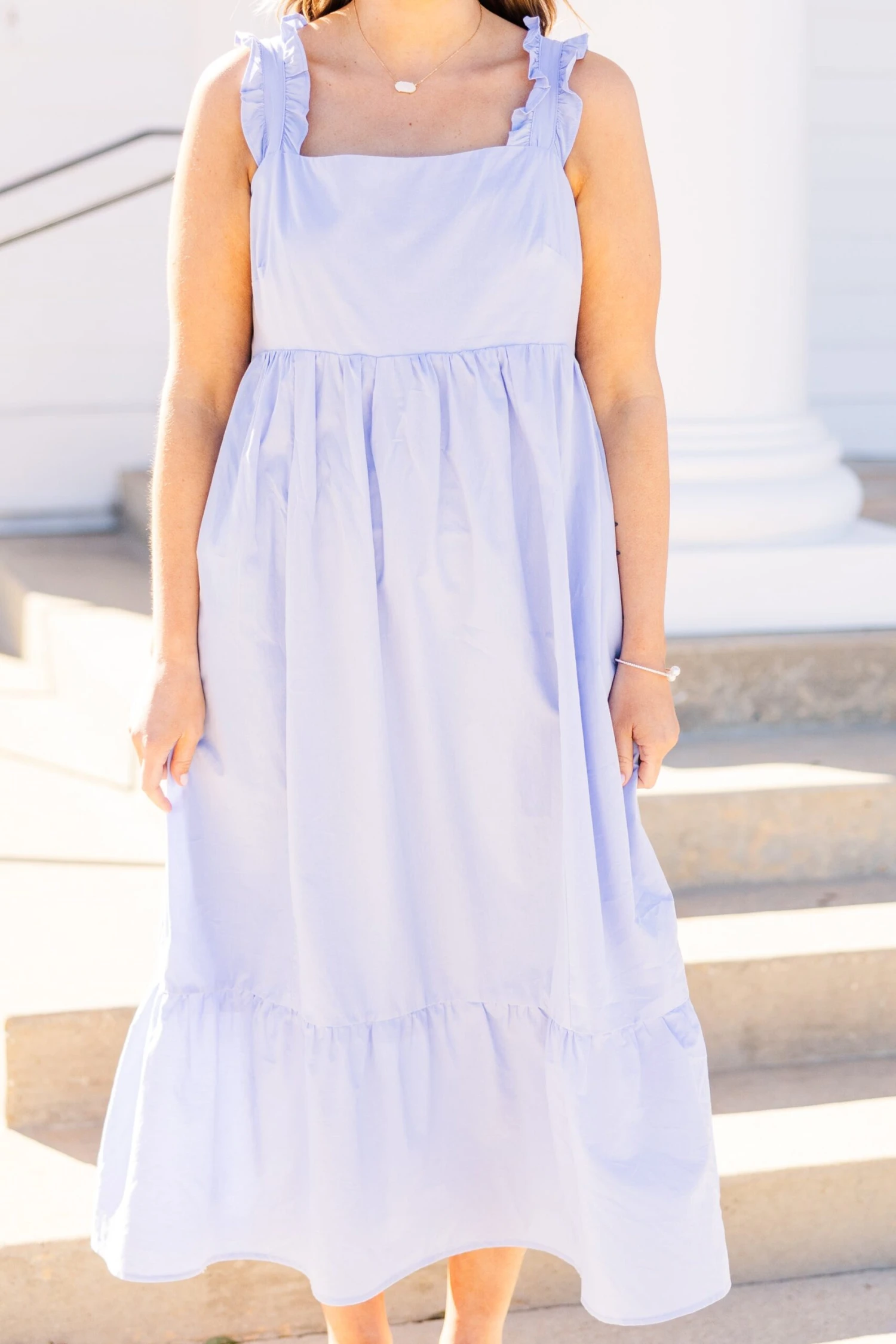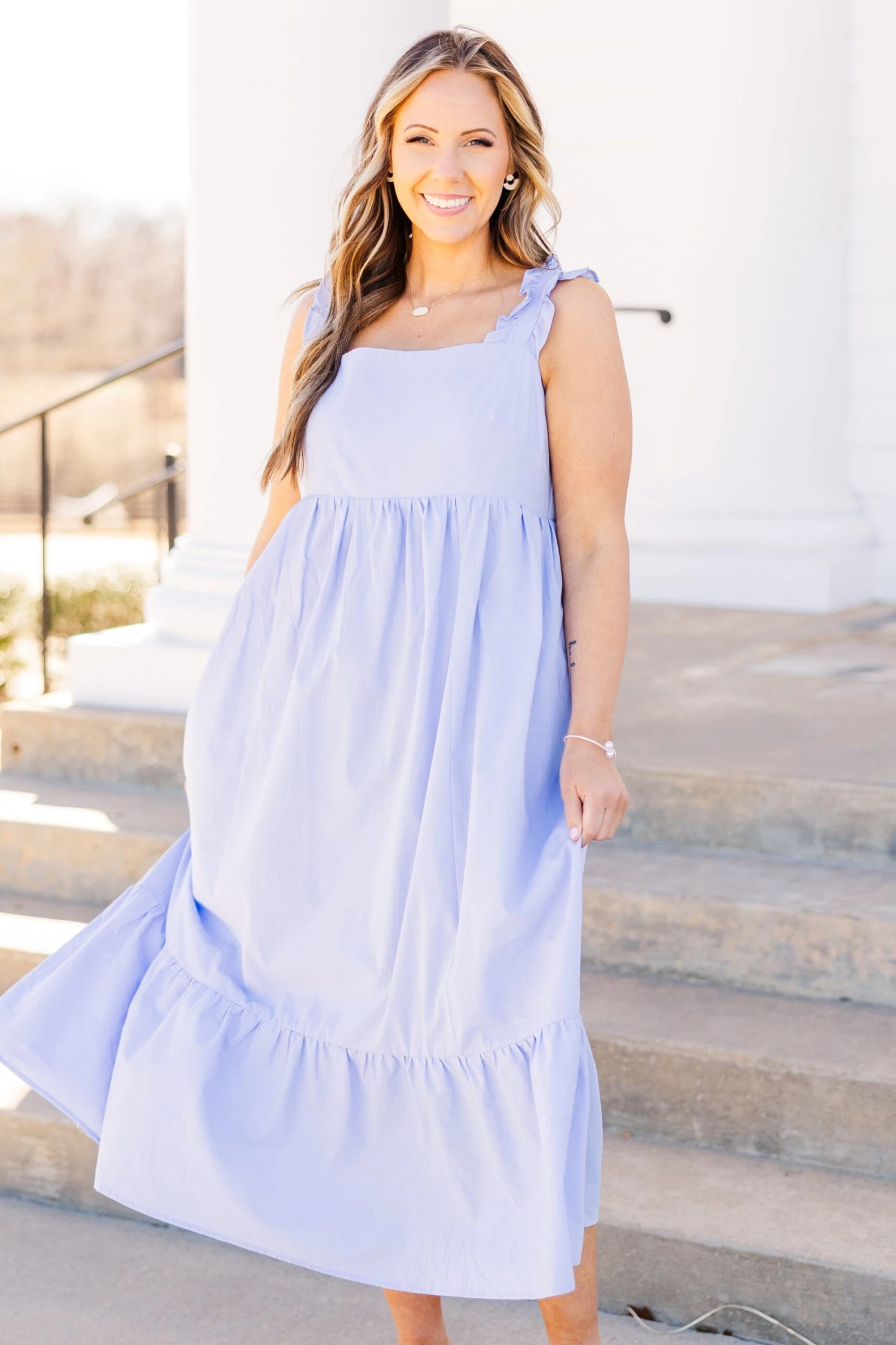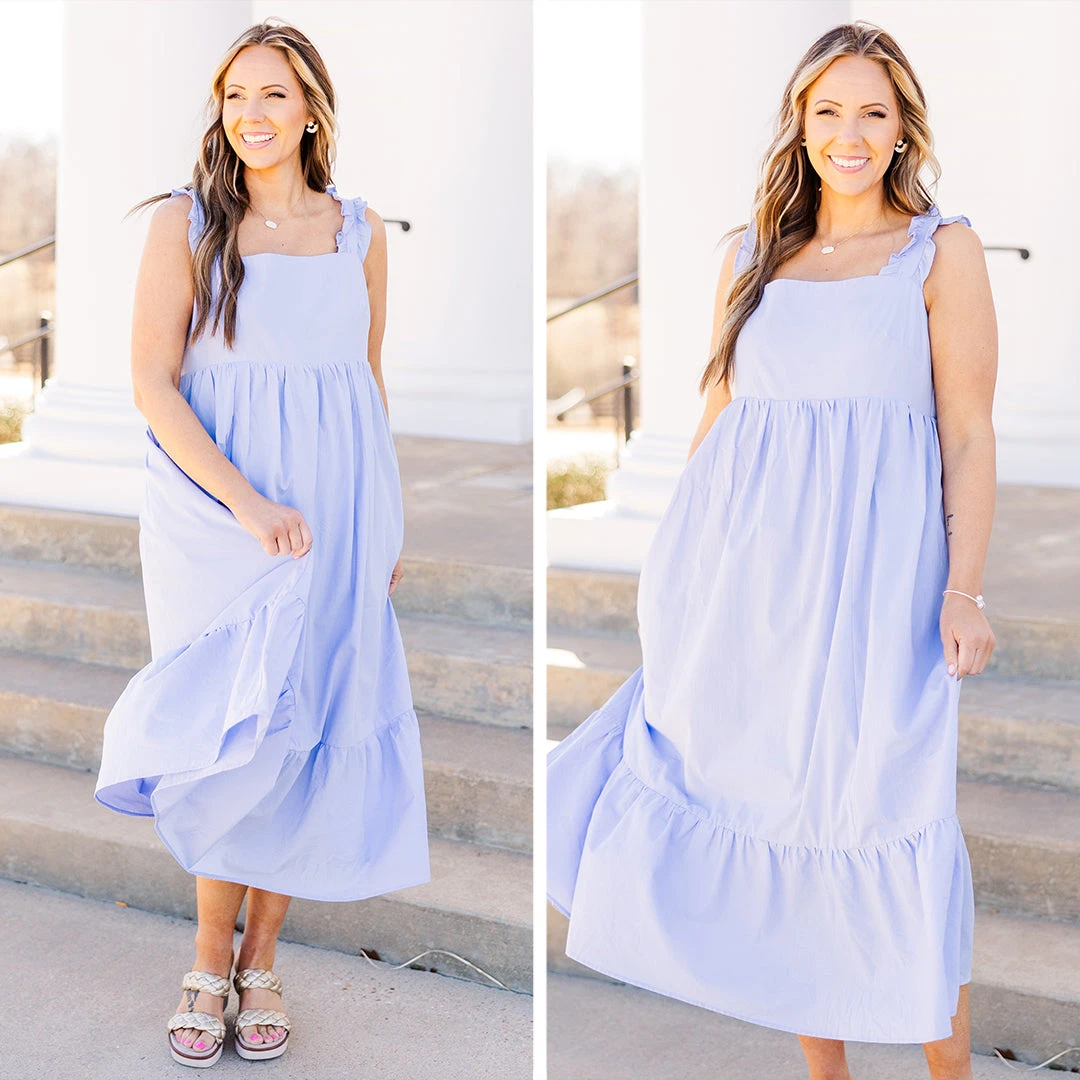 Expertly crafted with an adorable back cutout and tie, this dazzling dress in pretty periwinkle is a must-have for any fashionista! Its perfect midi length, functional pockets, and delicate ruffle detailing that make it ideal for a walk along the beach or a casual brunch date! Elevate your style with this versatile and chic dress!