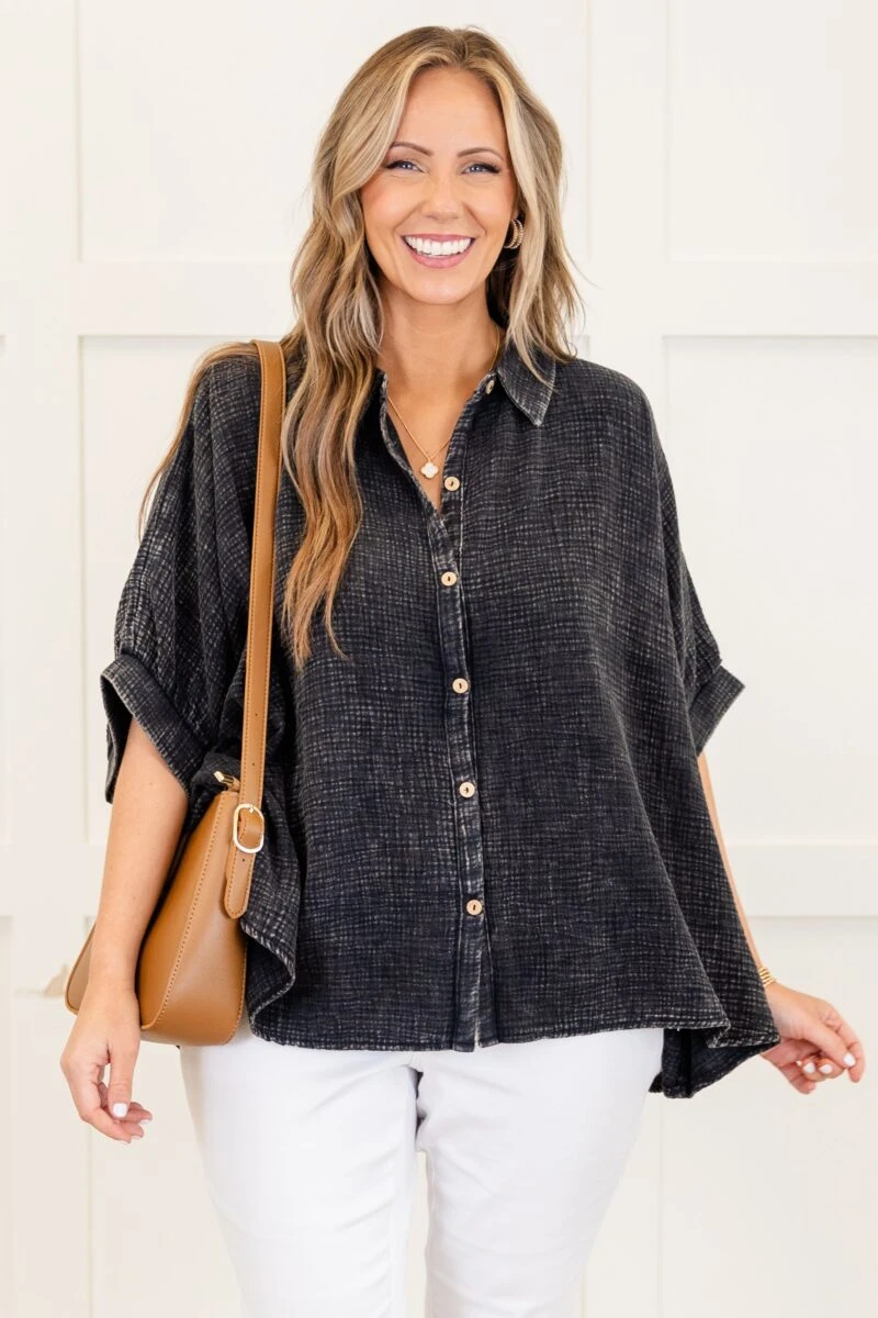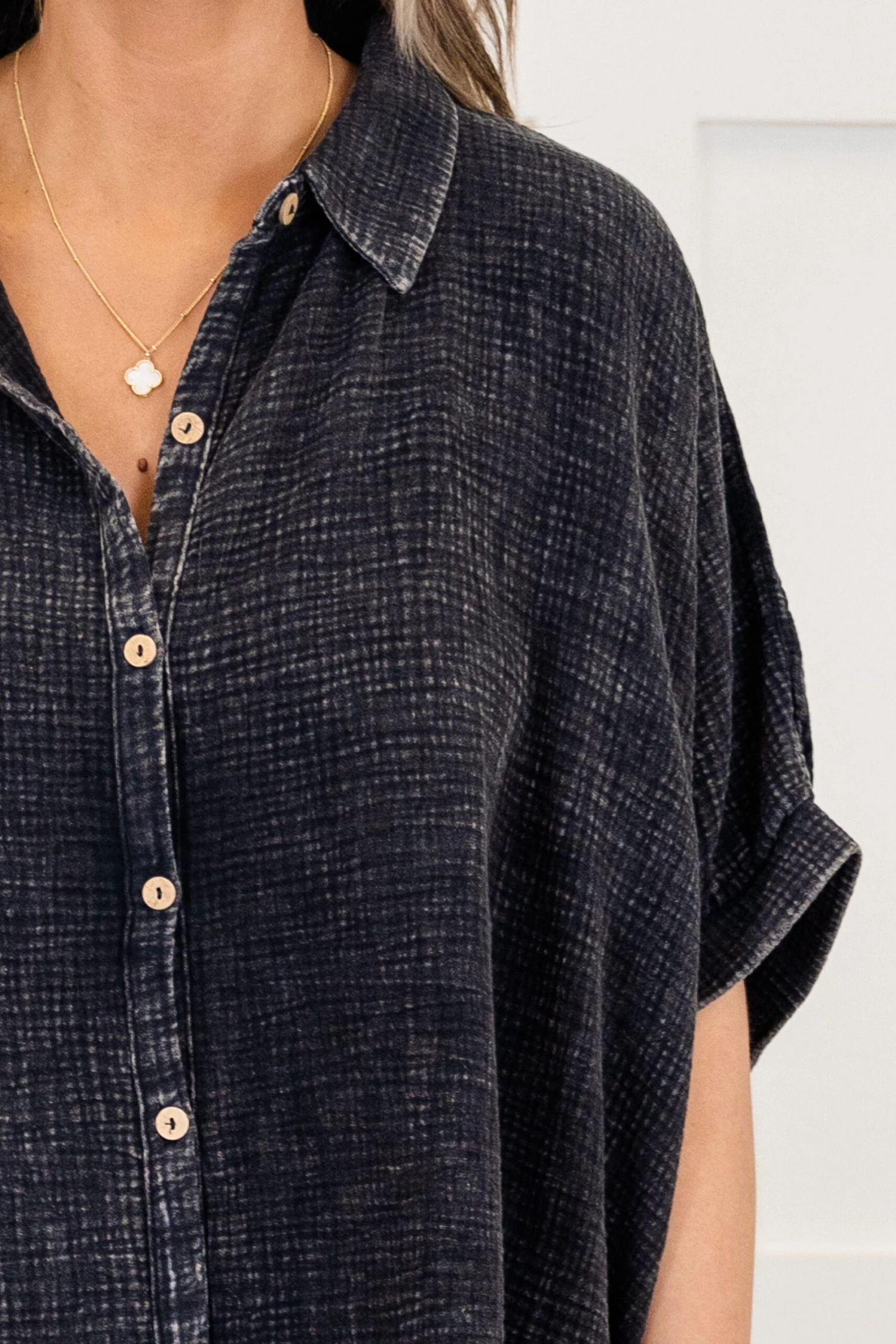 Unleash your carefree spirit in our Wistful Weekend Top! Crafted from washed double gauze, this button down shirt features half sleeves for a laid-back vibe! Perfect for a relaxed weekend look, it’s time to embrace your inner cool in ash black!