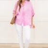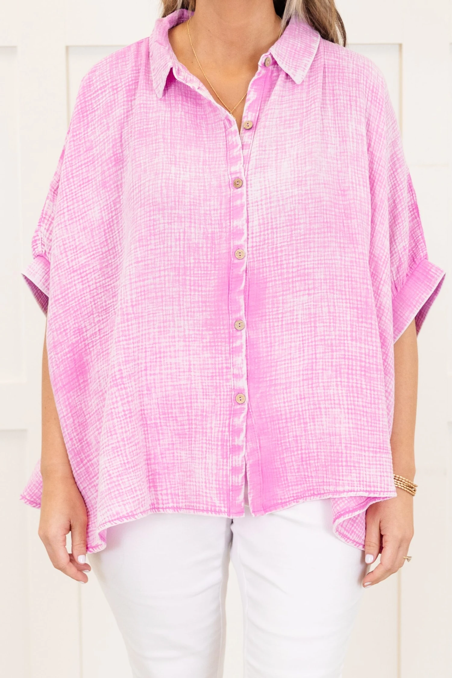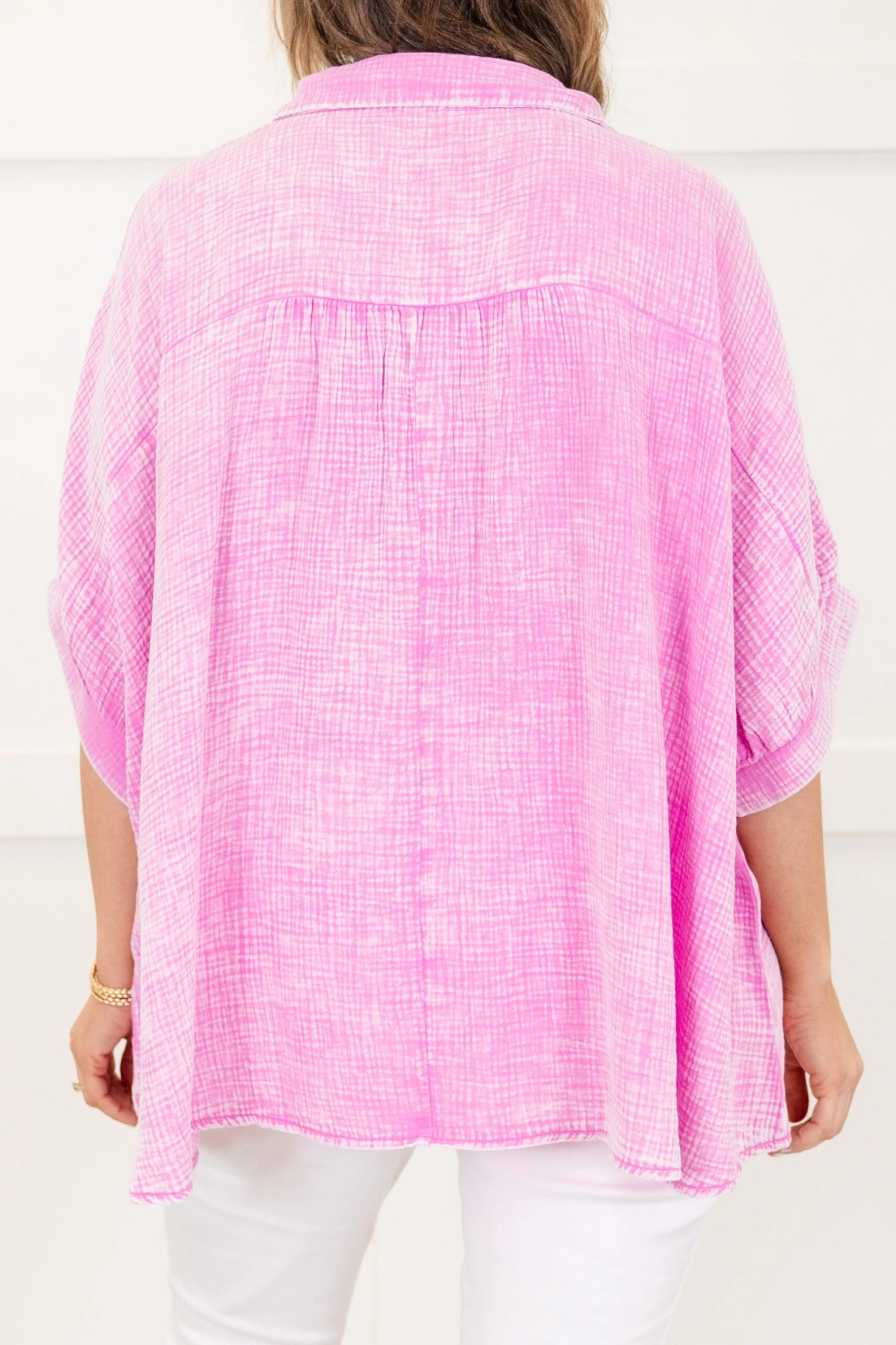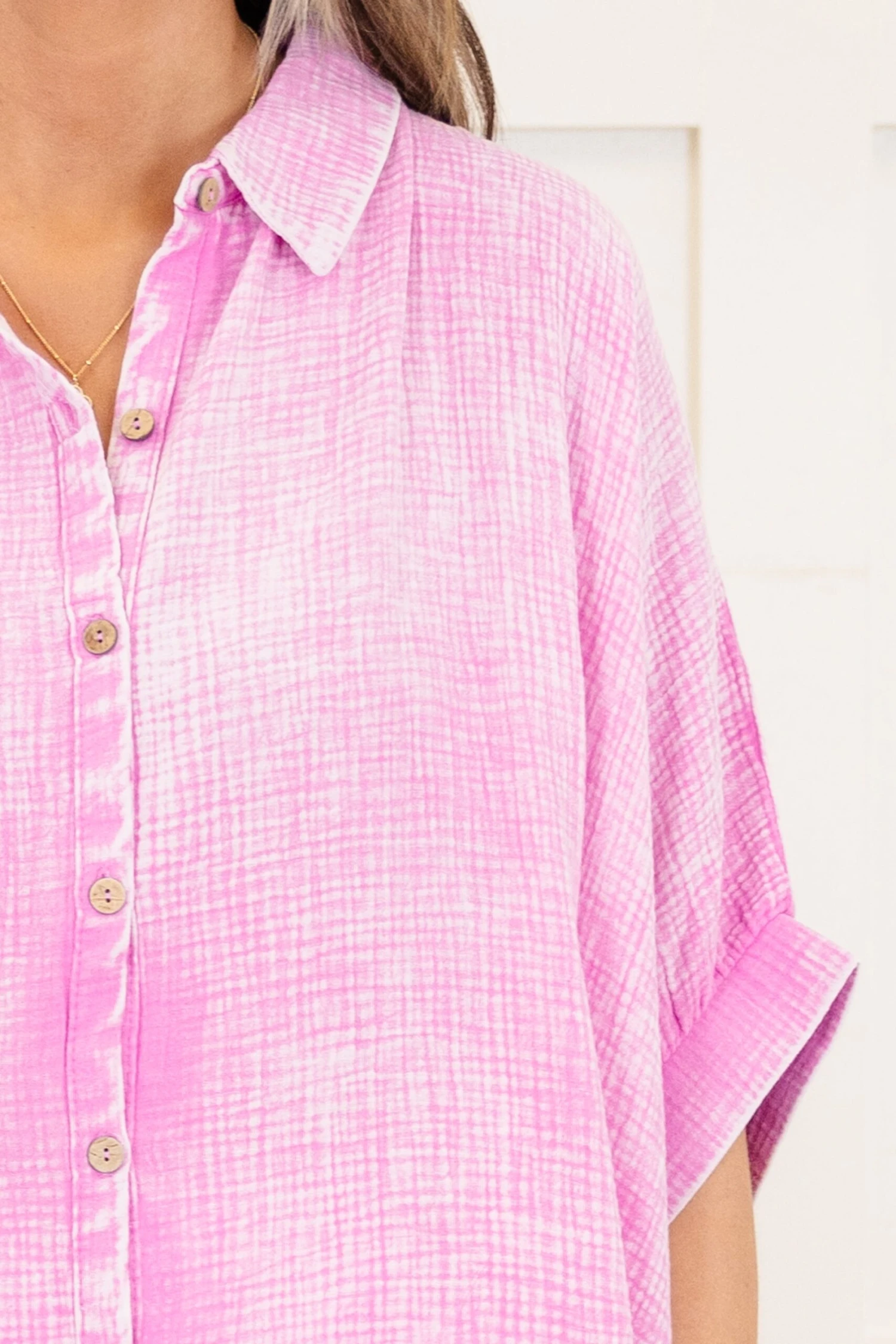 Unleash your carefree spirit in our Wistful Weekend Top! Crafted from washed double gauze, this button down shirt features half sleeves for a laid-back vibe! Perfect for a relaxed weekend look, it’s time to embrace your inner cool in mauve!