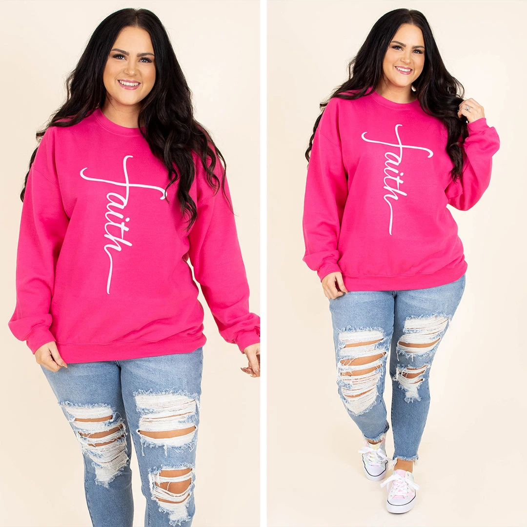 We have faith that you’ll love this sweatshirt! The simple, cute graphic, lovely pink color, and figure flattering fit is just what you need this season! Simply pair this sweatshirt with some cute skinnies and sneakers for an everyday, chic look!