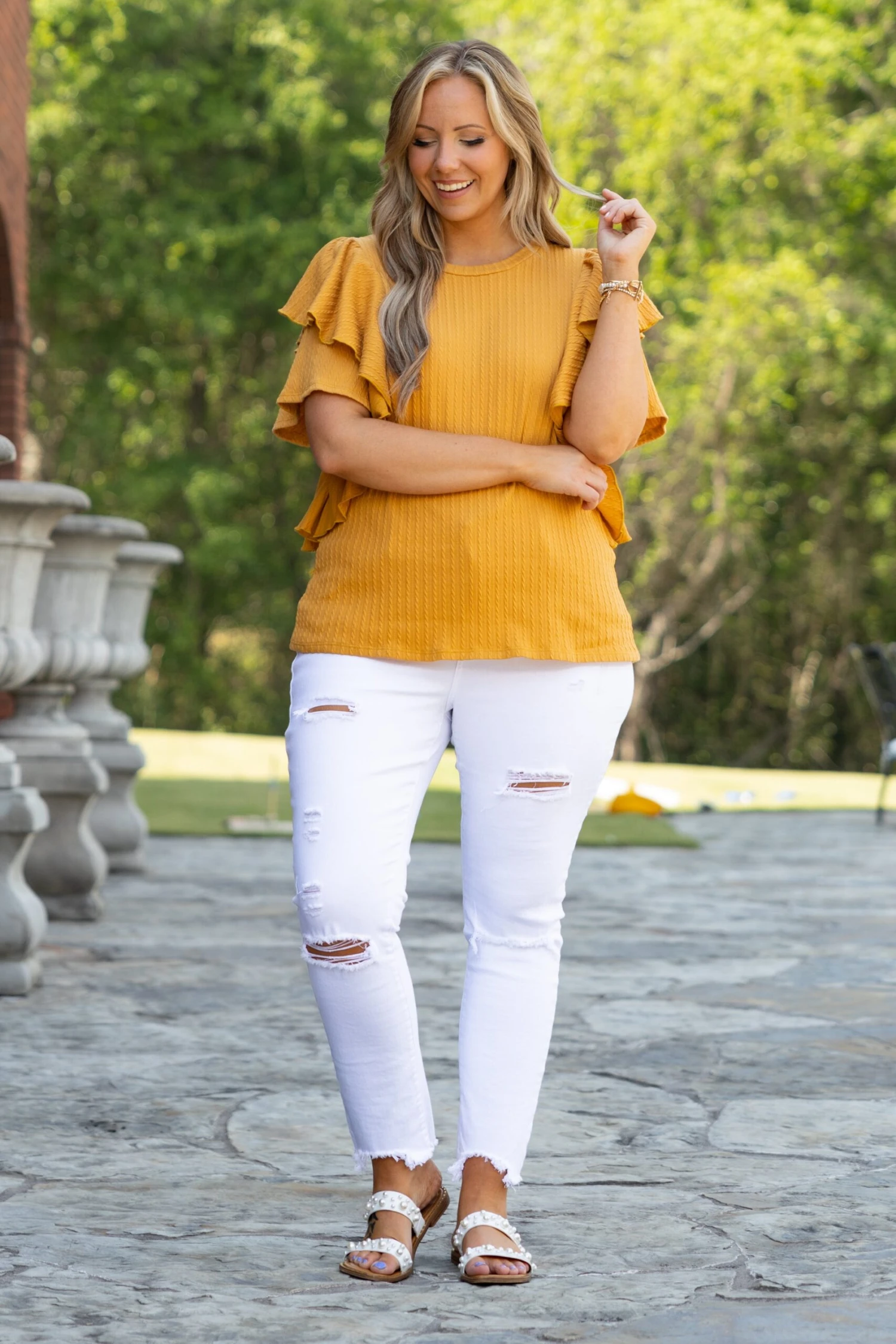 This top is made of a lightweight and textured fabric, making it perfect for summer wear! Its flutter sleeves provide a breathable and comfortable fit, while its simple yet stylish design completes any look! Enjoy sunny days while remaining cool and fashionable!