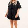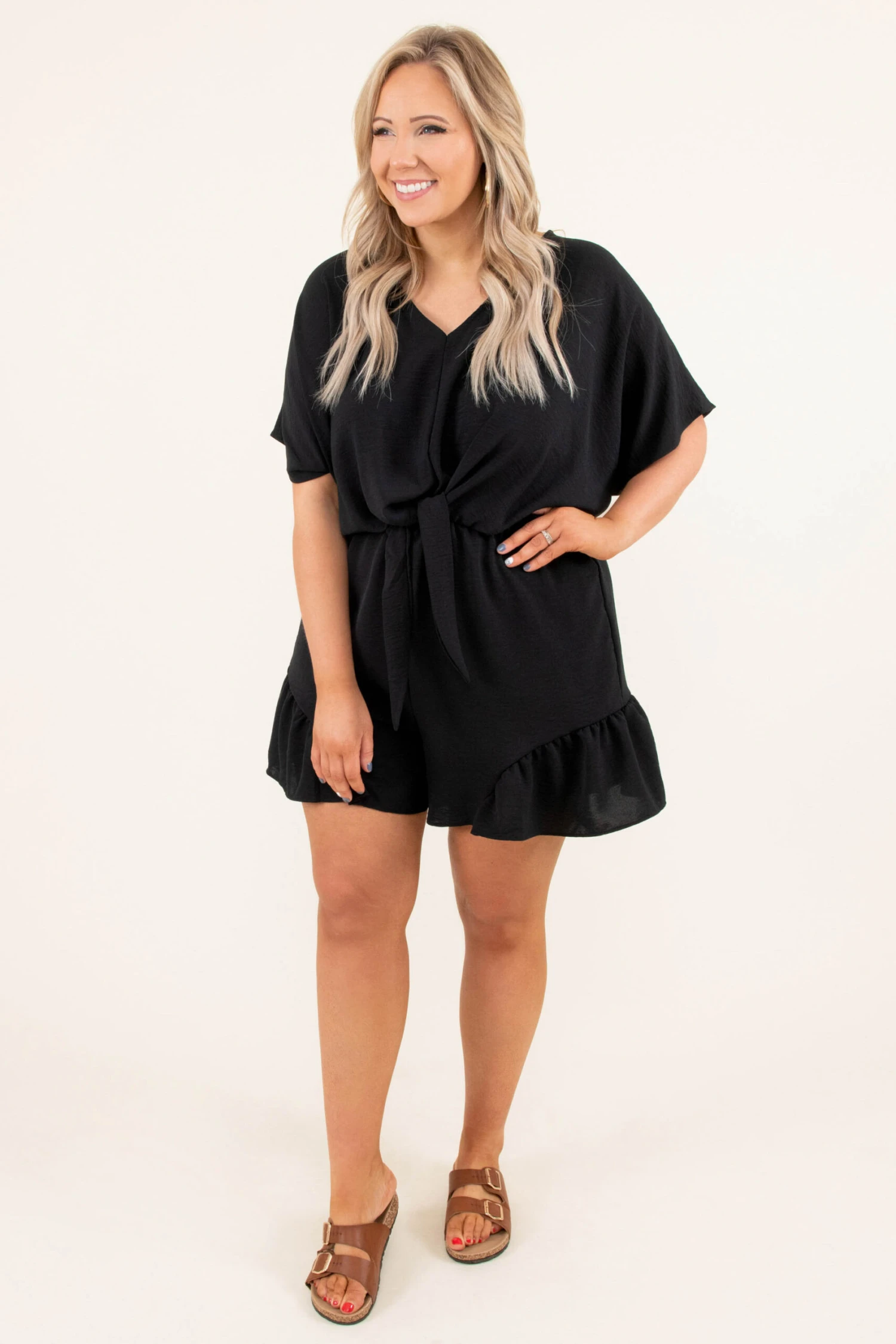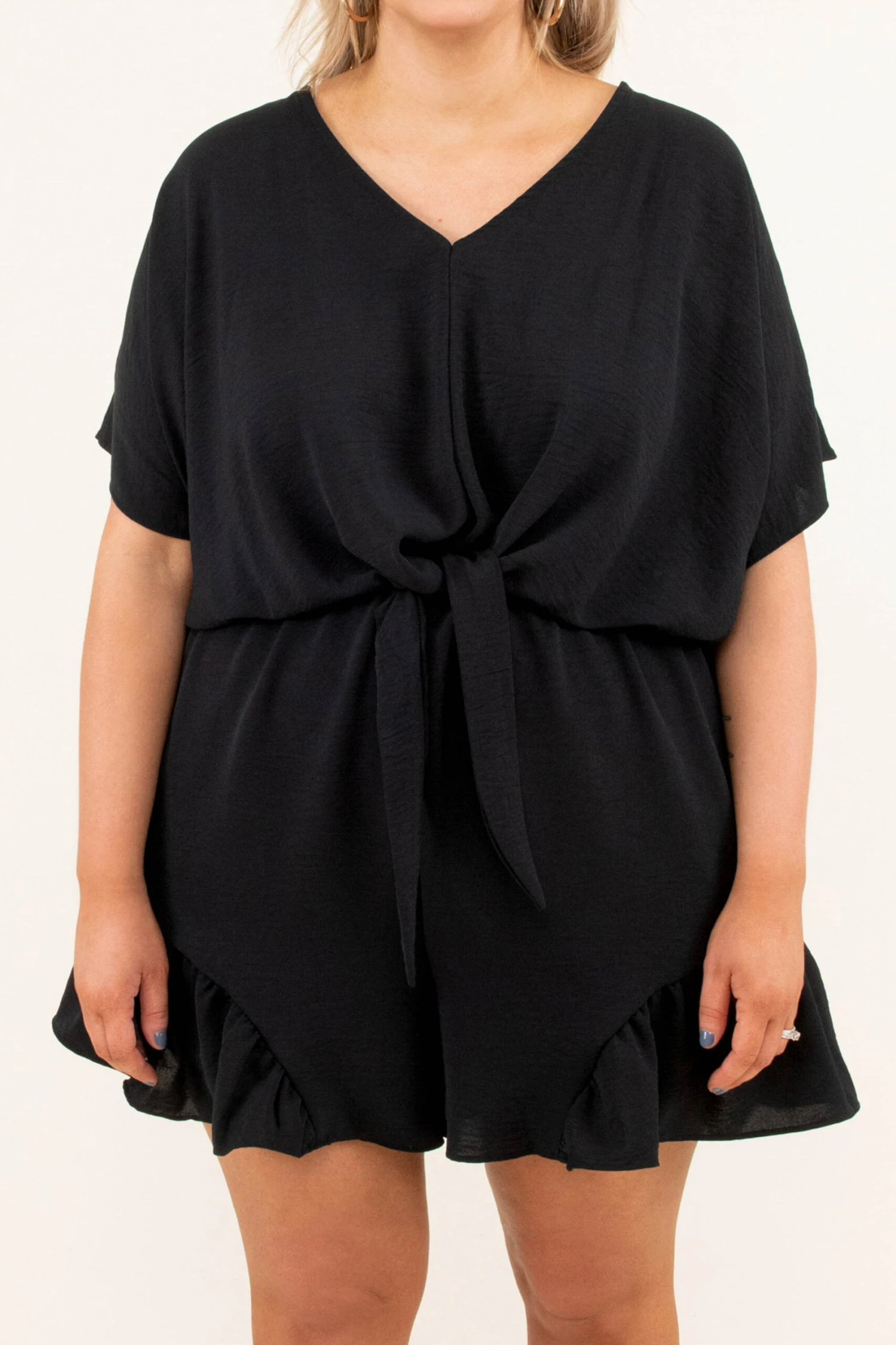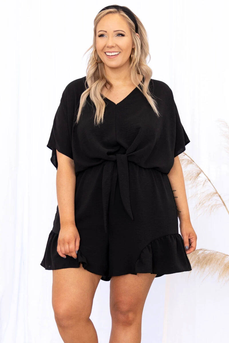 This stylish romper is our favorite right now! The black color can be paired with anything from a date night to your next party! The tie at the waist means you can adjust this babe to however you like! Dress this up with your favorite statement accessories and booties for a look that screams chic!
