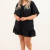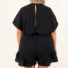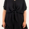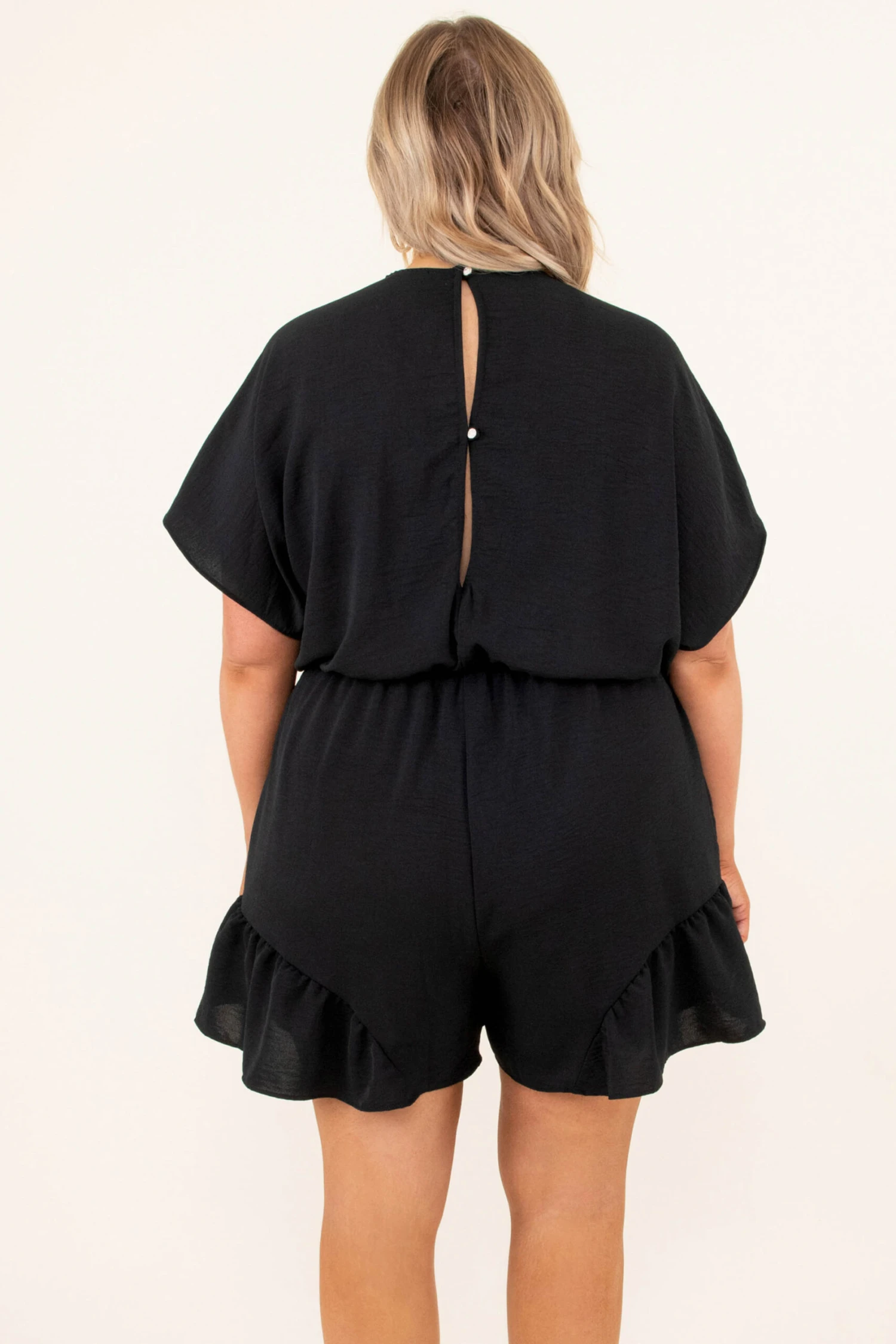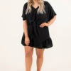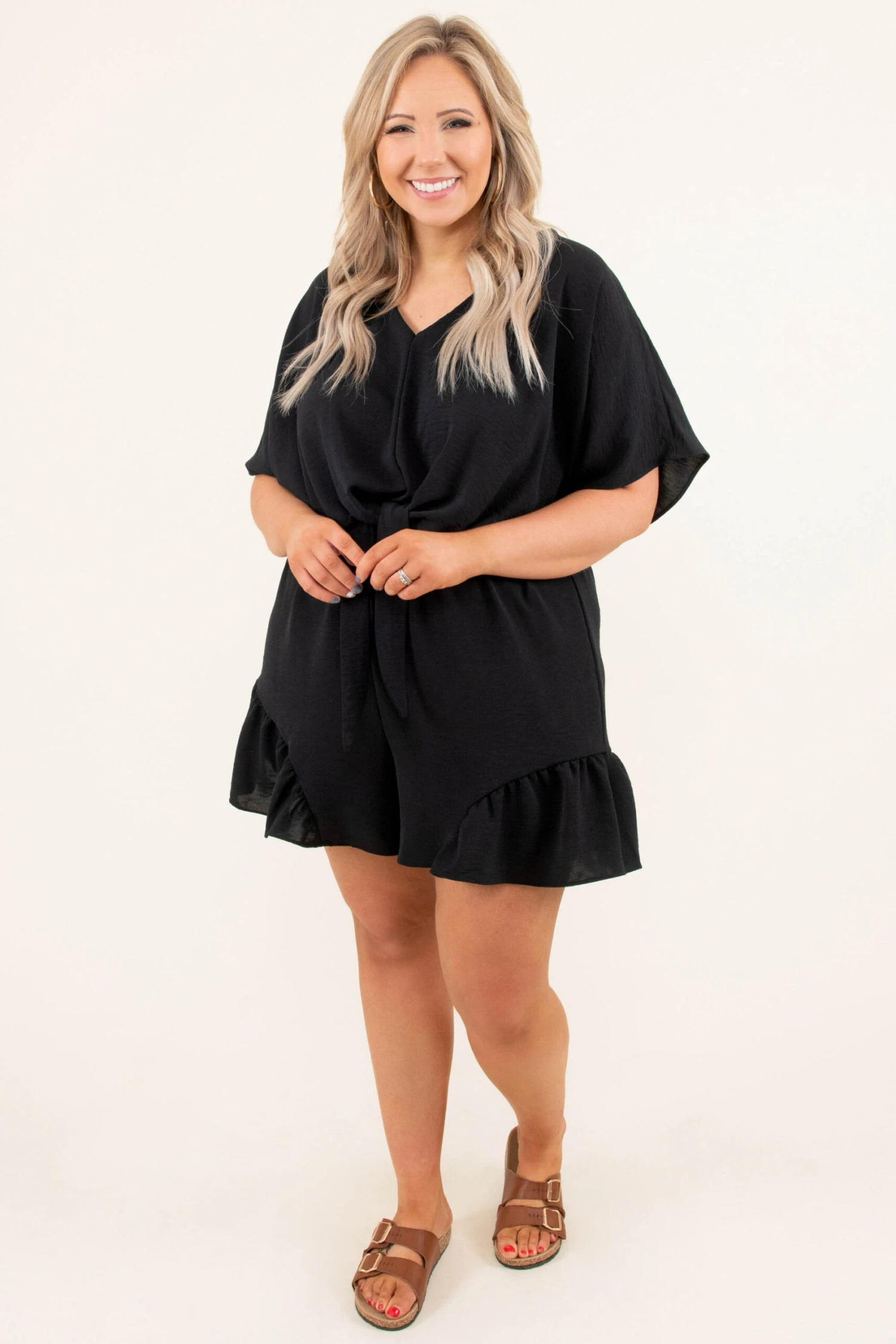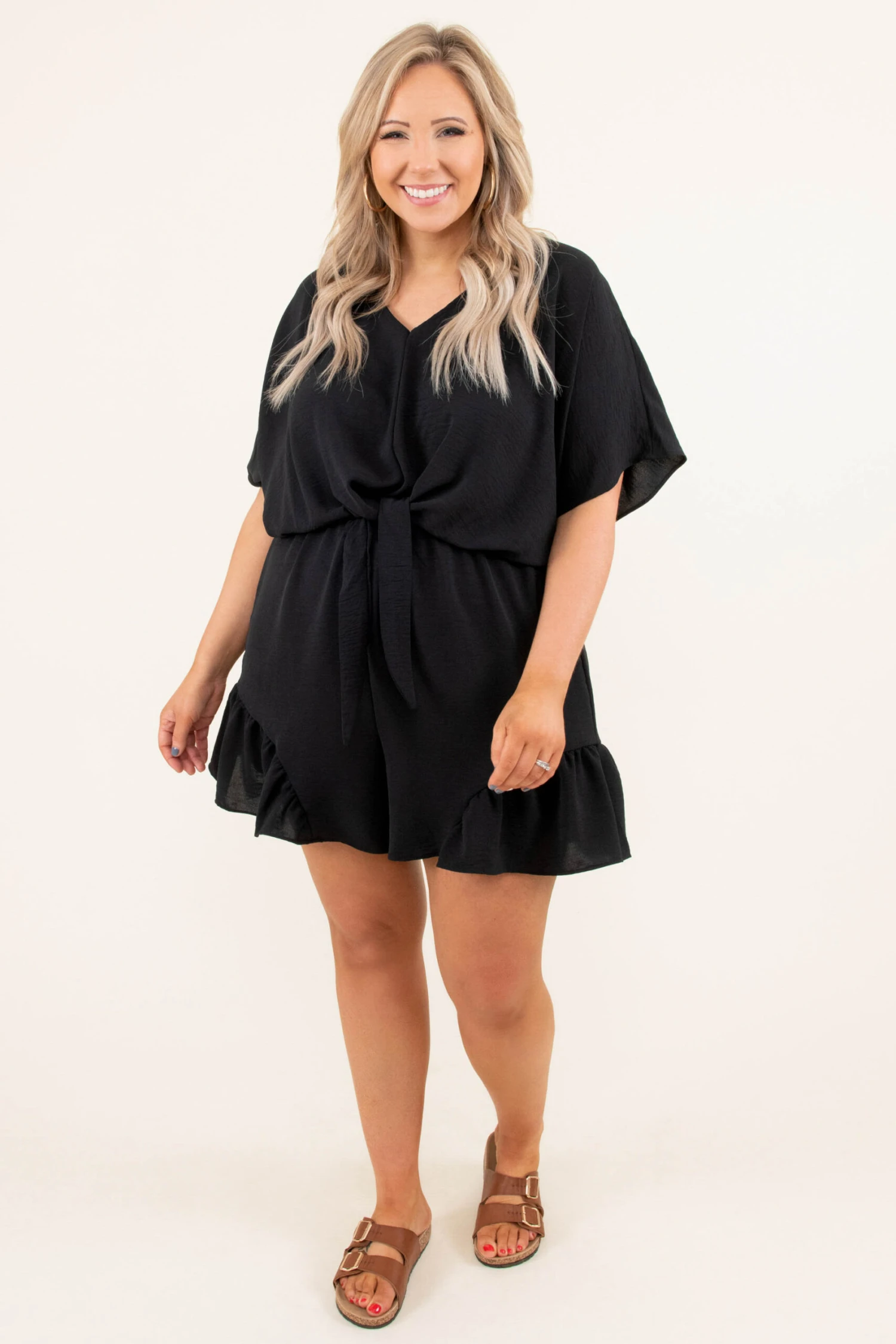 This stylish romper is our favorite right now! The black color can be paired with anything from a date night to your next party! The tie at the waist means you can adjust this babe to however you like! Dress this up with your favorite statement accessories and booties for a look that screams chic!