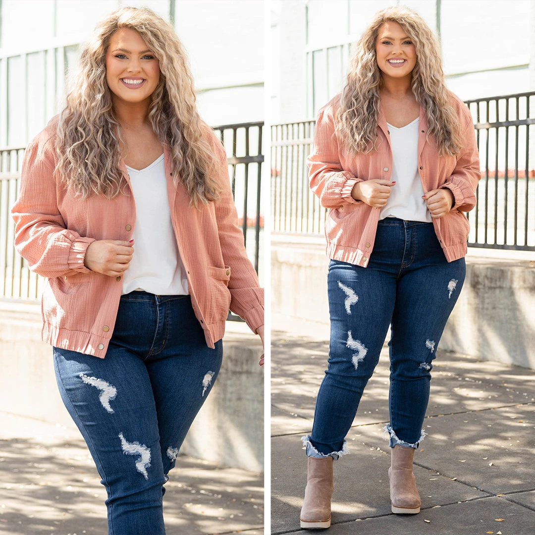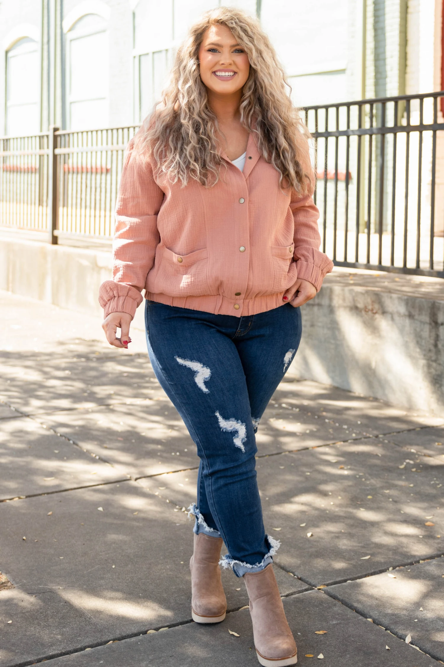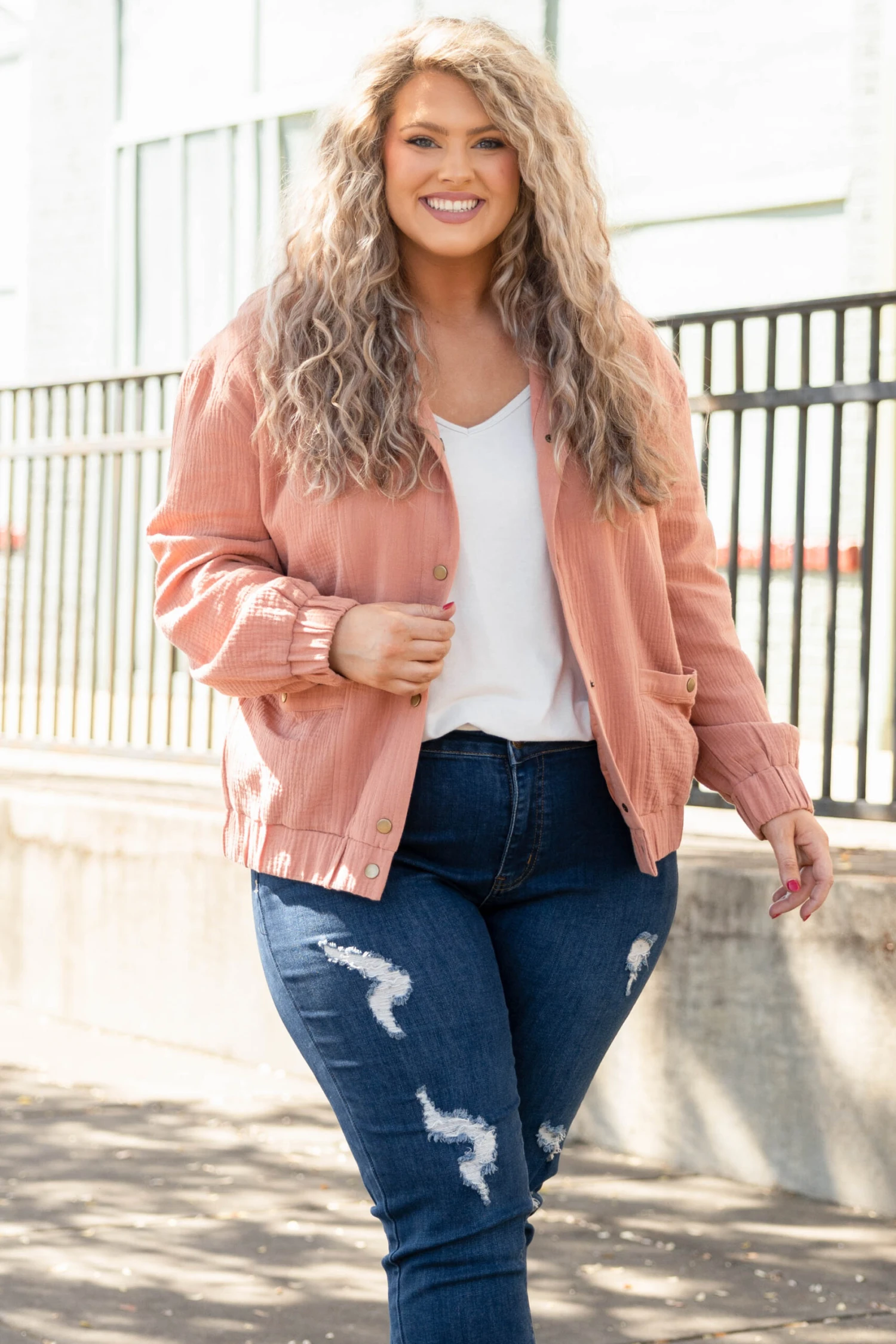 We are wonderstruck by this gorgeous jacket! This jacket has a soft pink color and chic fit that pairs perfect with all of your faves this season! The snap buttons and ribbed texture is so sweet! Simply style this jacket with a cute top and skinnies for a classic, chic look!