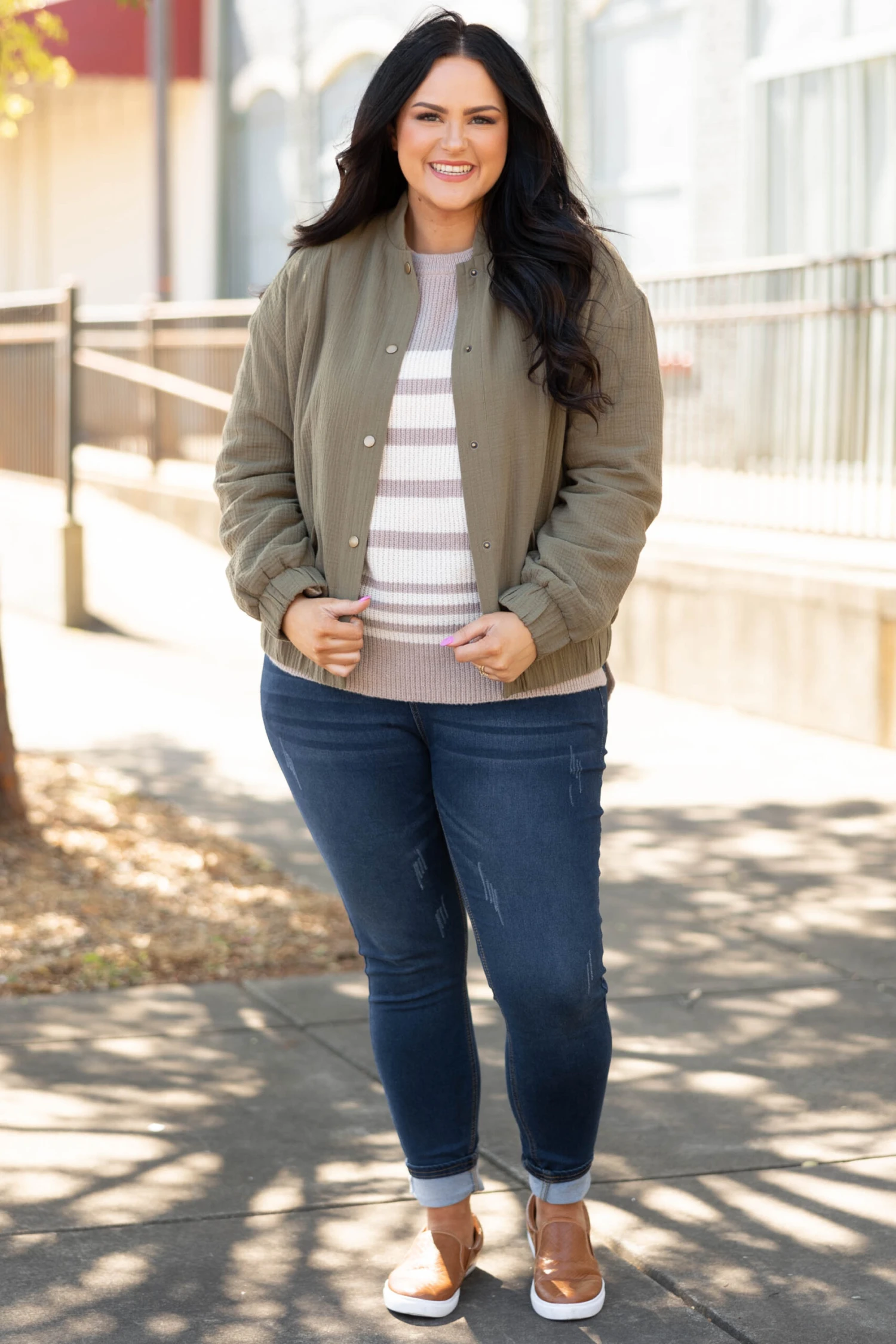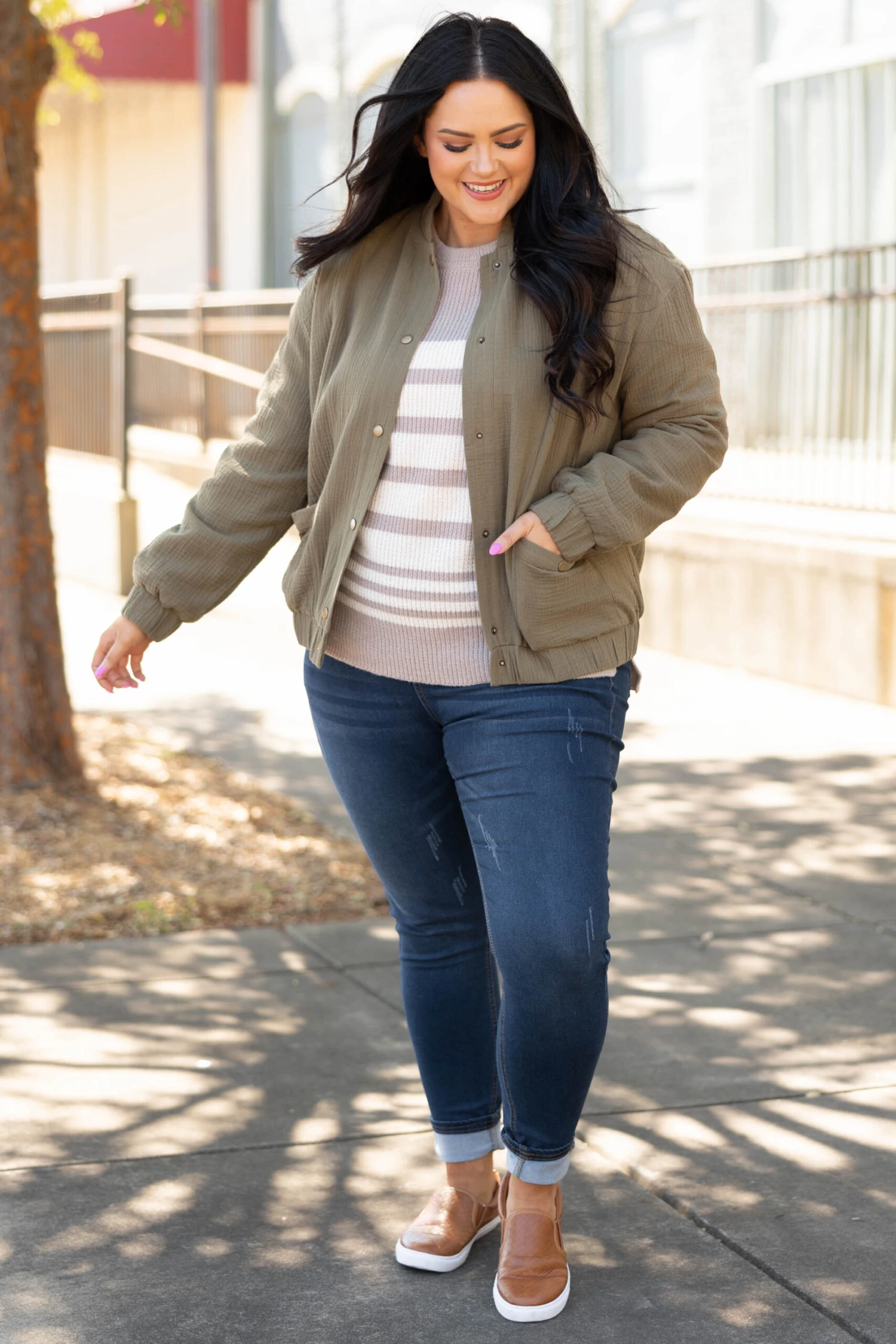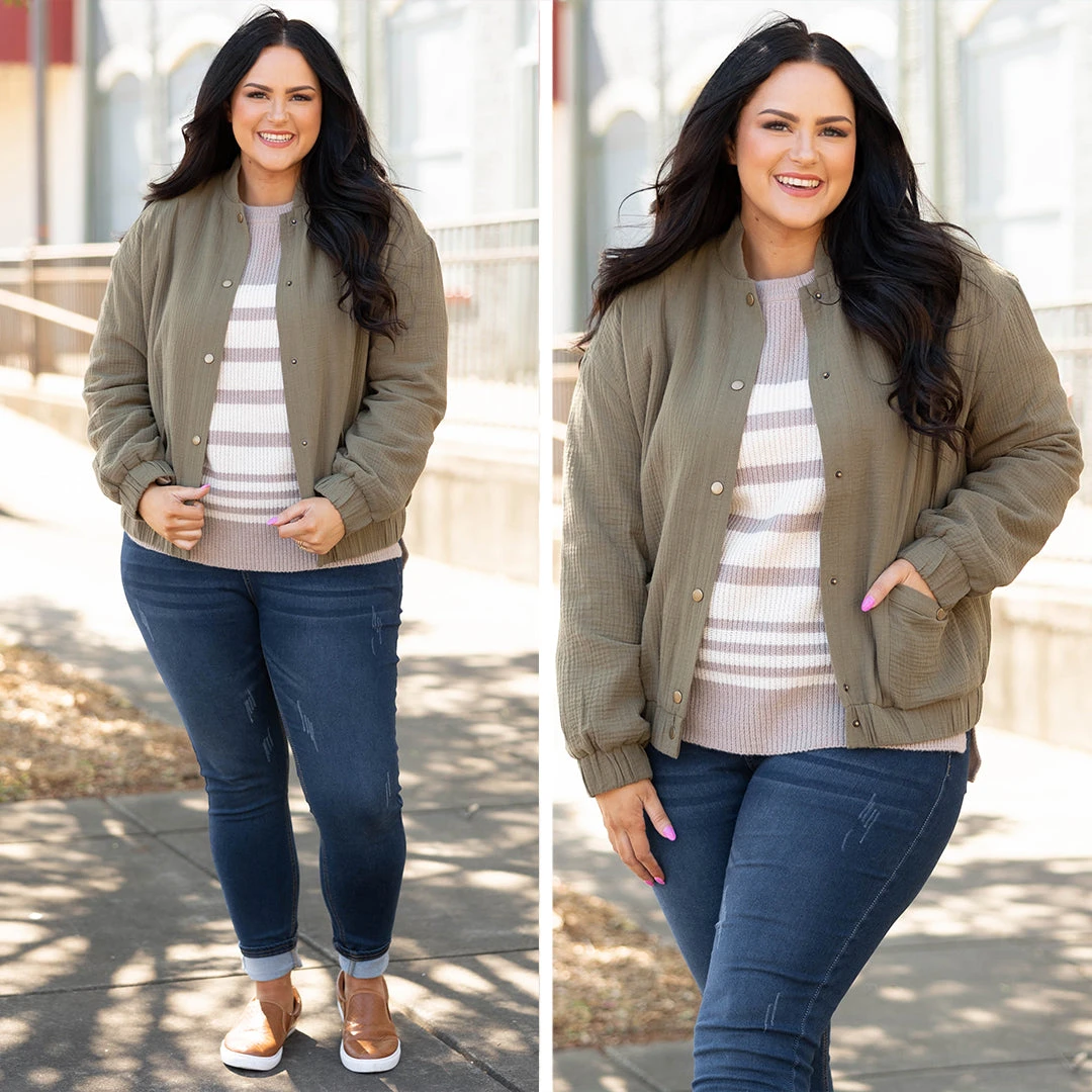 We are wonderstruck by this gorgeous jacket! This jacket has a soft sage color and chic fit that pairs perfect with all of your faves this season! The snap buttons and ribbed texture is so sweet! Simply style this jacket with a cute top and skinnies for a classic, chic look!