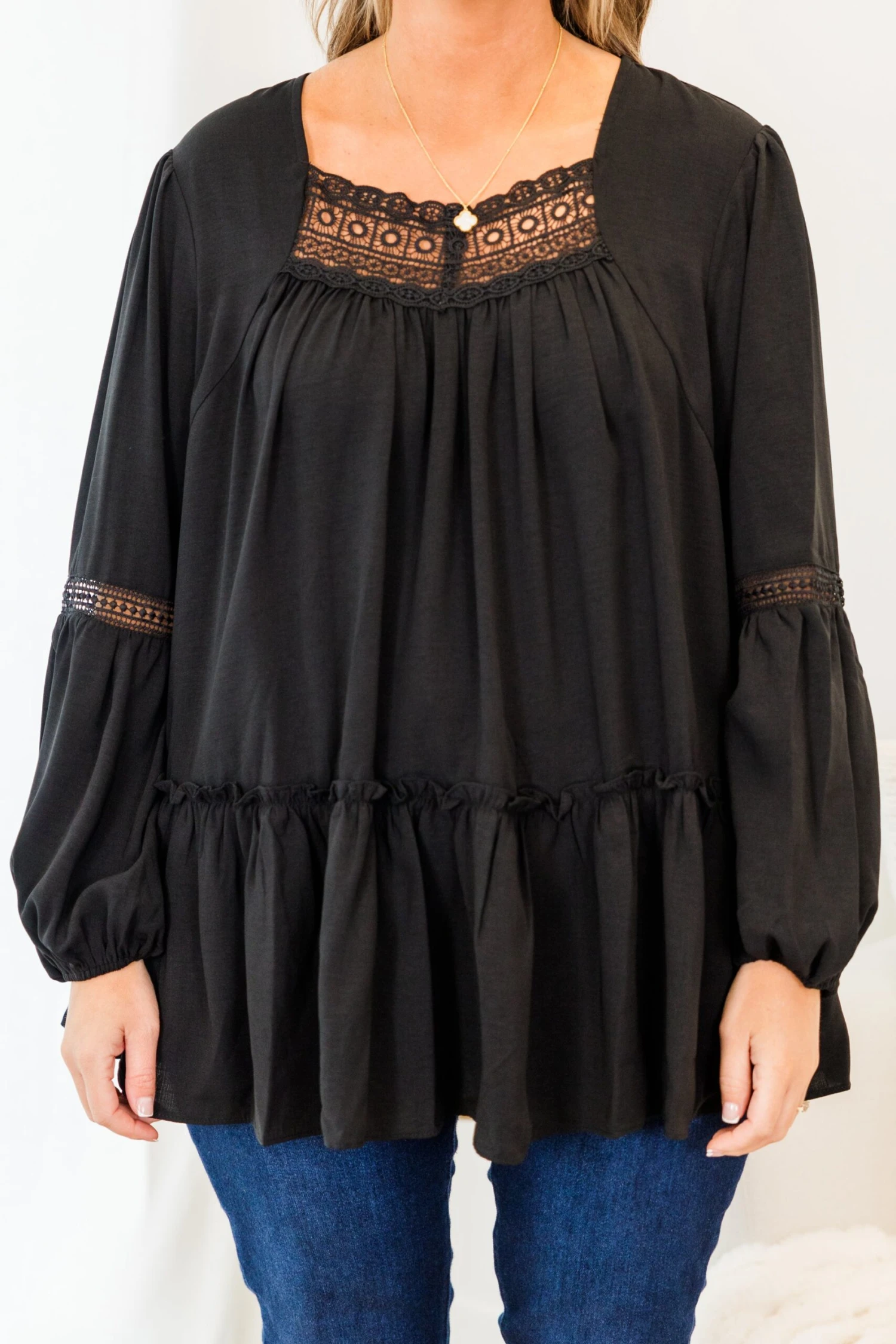 You’ll be the center of attention in this classic cutie! This top features delicate lace detailing, trendy bubble sleeves, and a neutral color for a timeless, classy look! Elevate your wardrobe with this elegant piece that exudes confidence and sophistication!