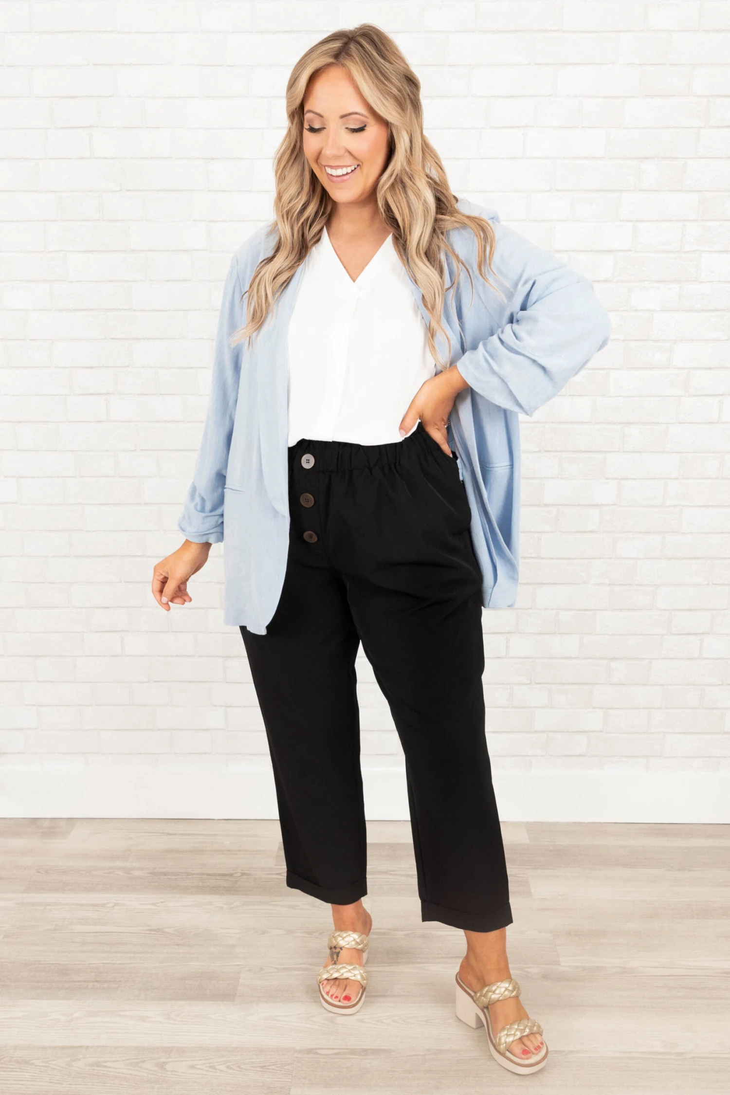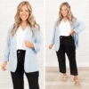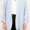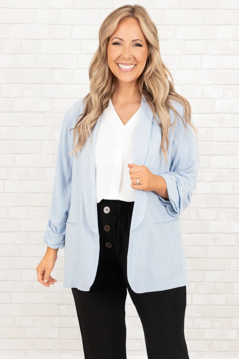 Work in style in this jacket! It has a solid light blue color that’s perfect for the season! It’s comfortable for all-day wear, has an oversized fit, and can be styled with your favorite shoes and accessories! Simply, pair this jacket with a cute top or dress for an effortlessly chic look!Â