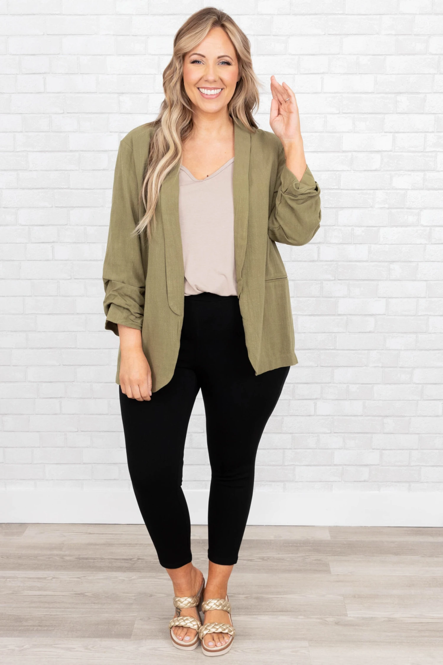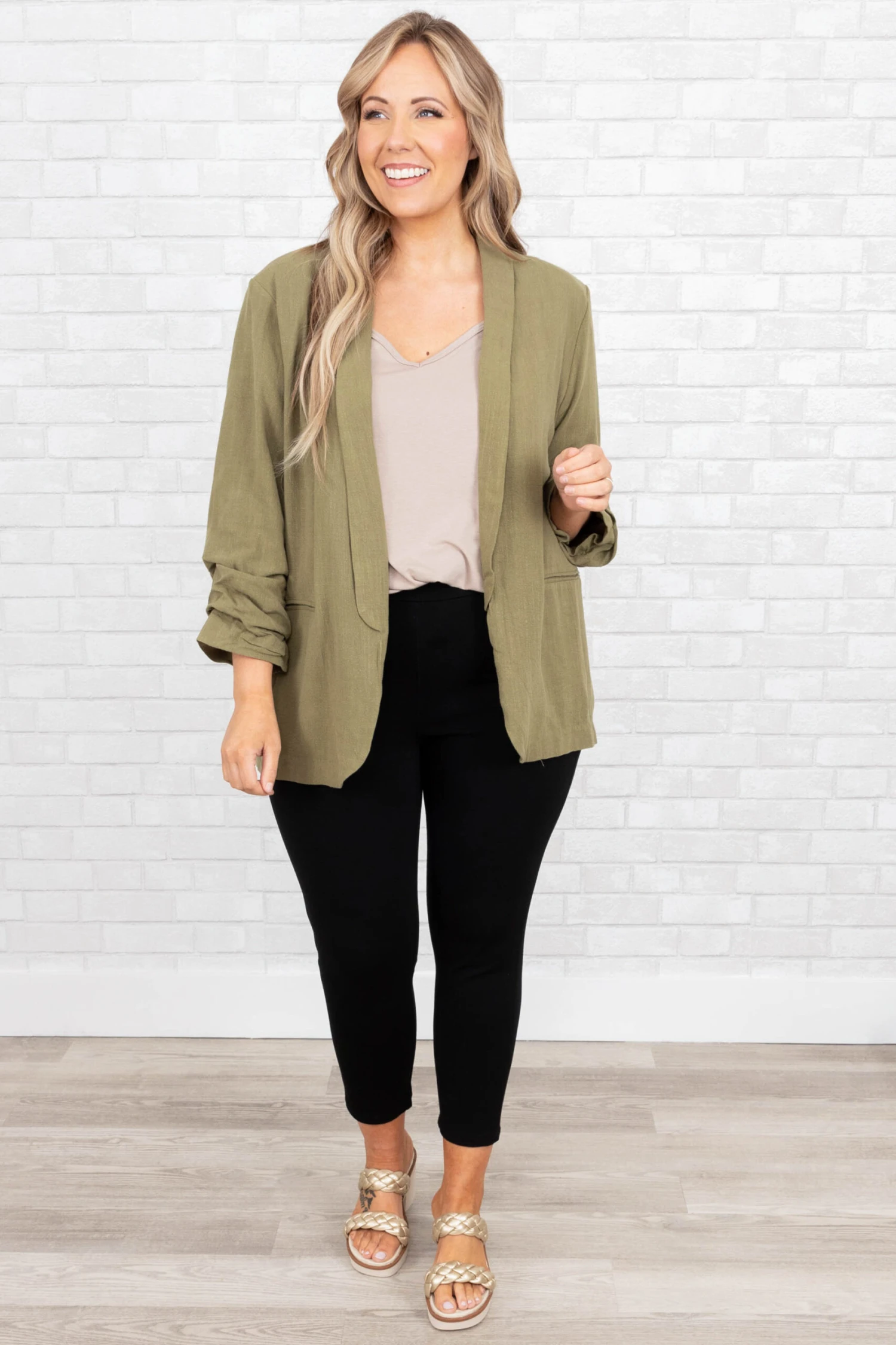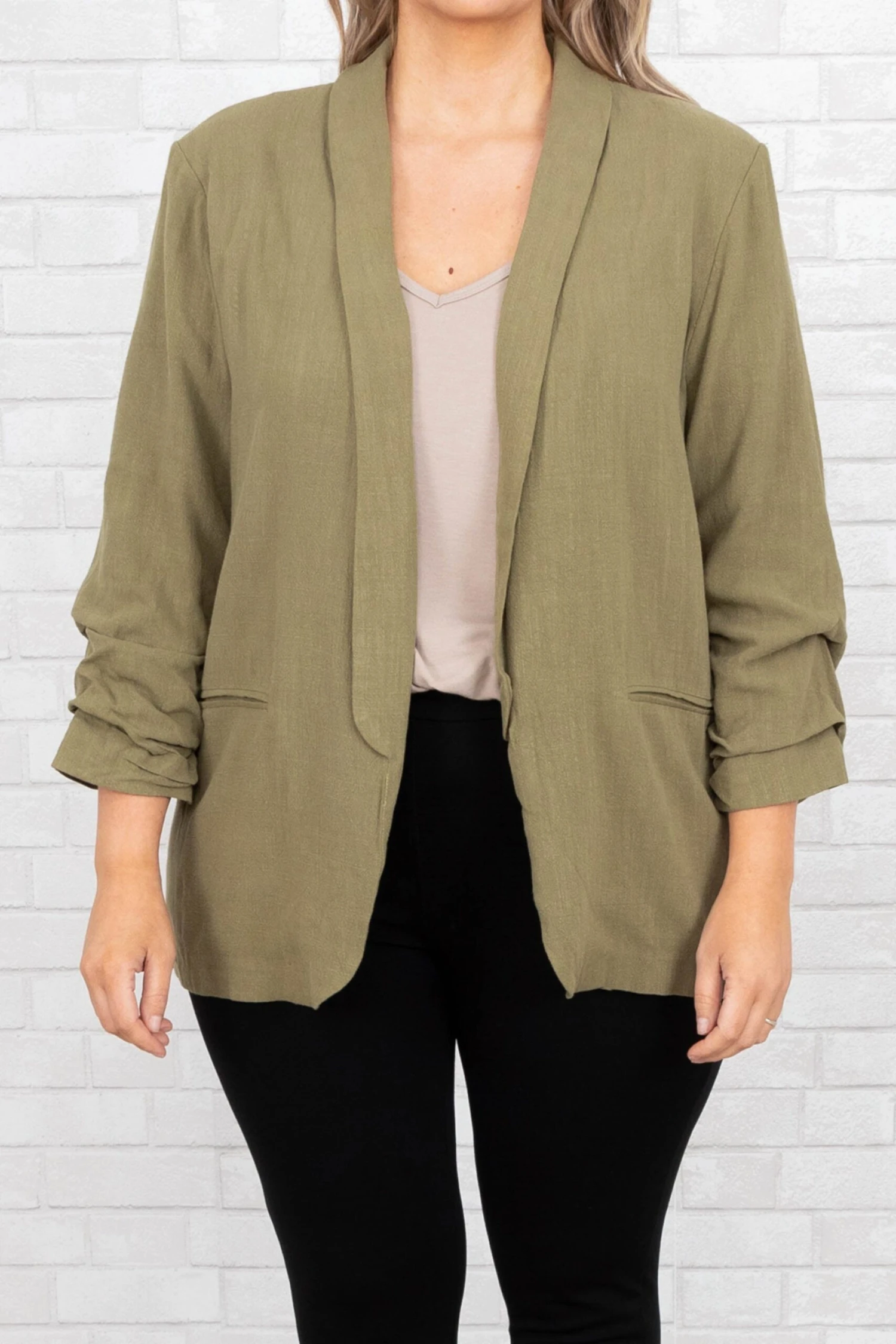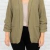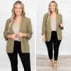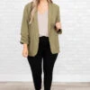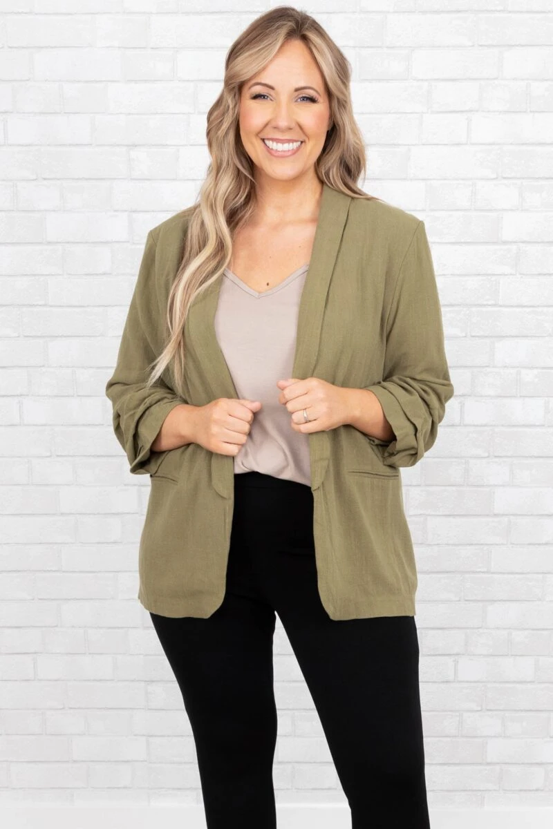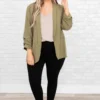 Work in style in this jacket! It has a solid olive color that’s perfect for the season! It’s comfortable for all-day wear, has an oversized fit, and can be styled with your favorite shoes and accessories! Simply, pair this jacket with a cute top or dress for an effortlessly chic look!Â