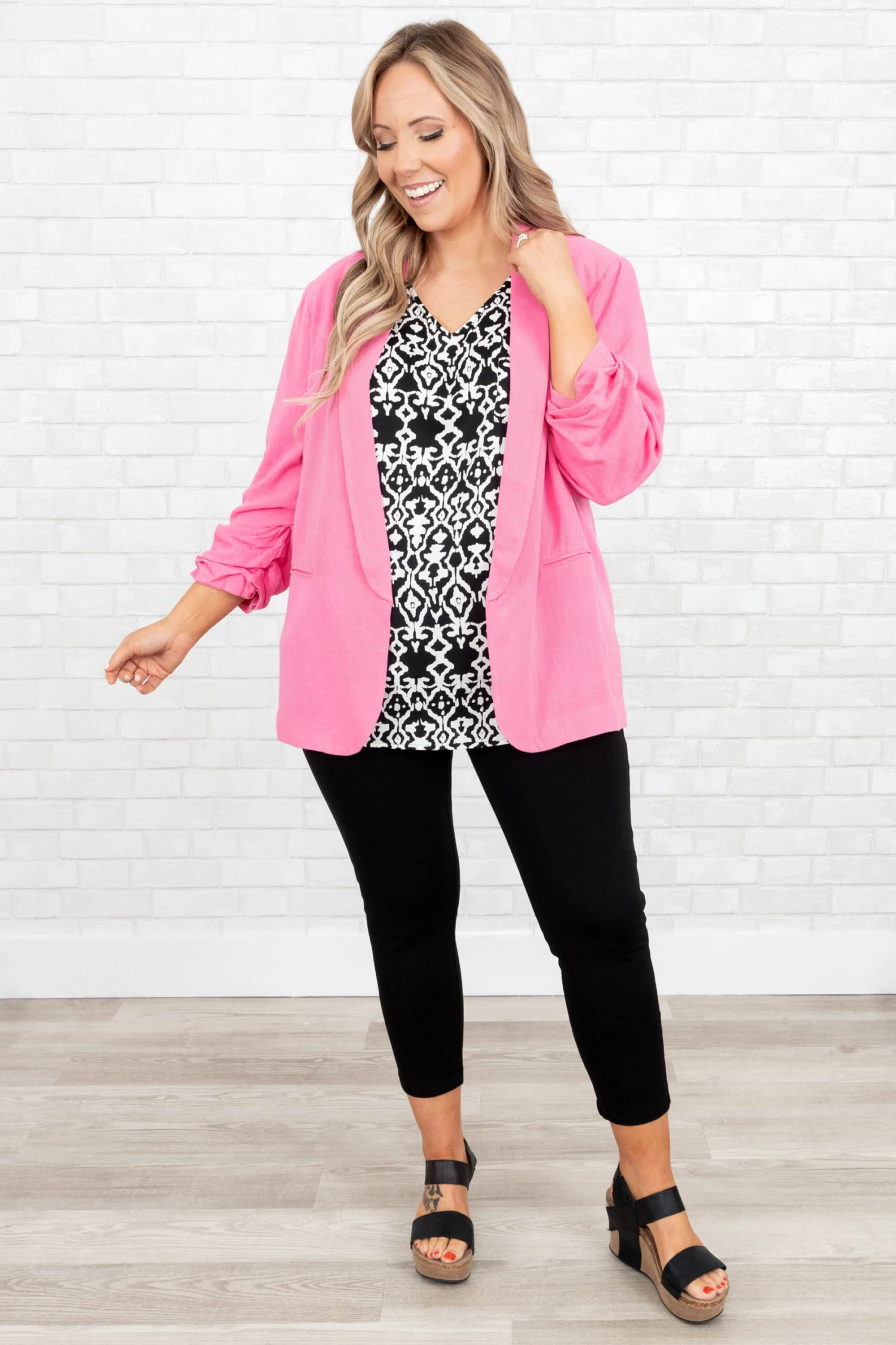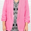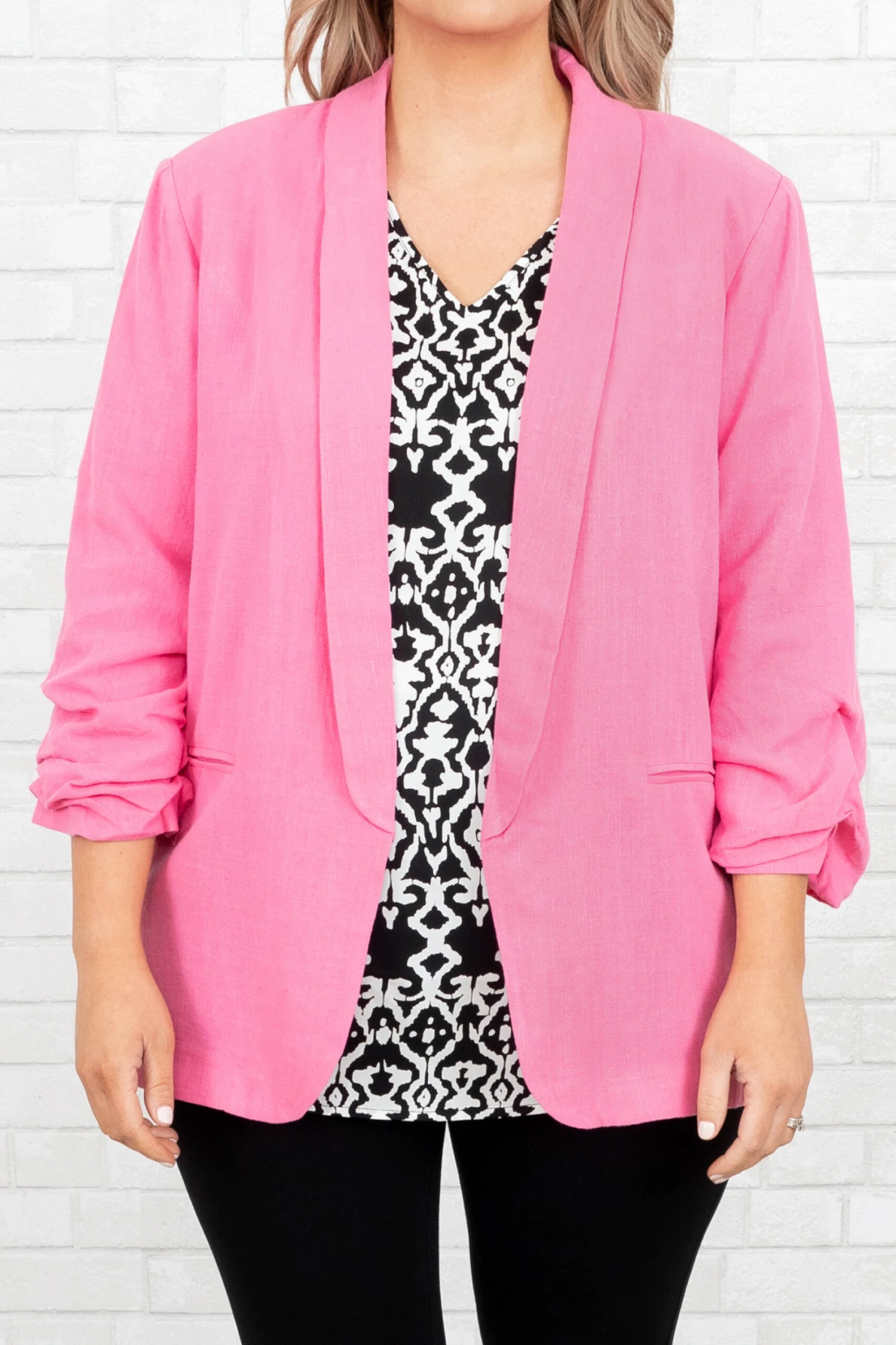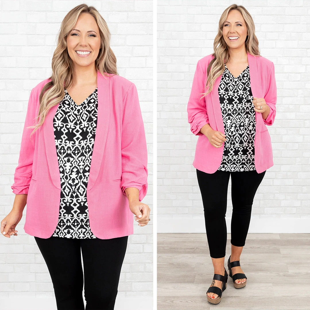 Work in style in this jacket! It has a solid pink color that’s perfect for the season! It’s comfortable for all-day wear, has an oversized fit, and can be styled with your favorite shoes and accessories! Simply, pair this jacket with a cute top or dress for an effortlessly chic look!Â