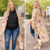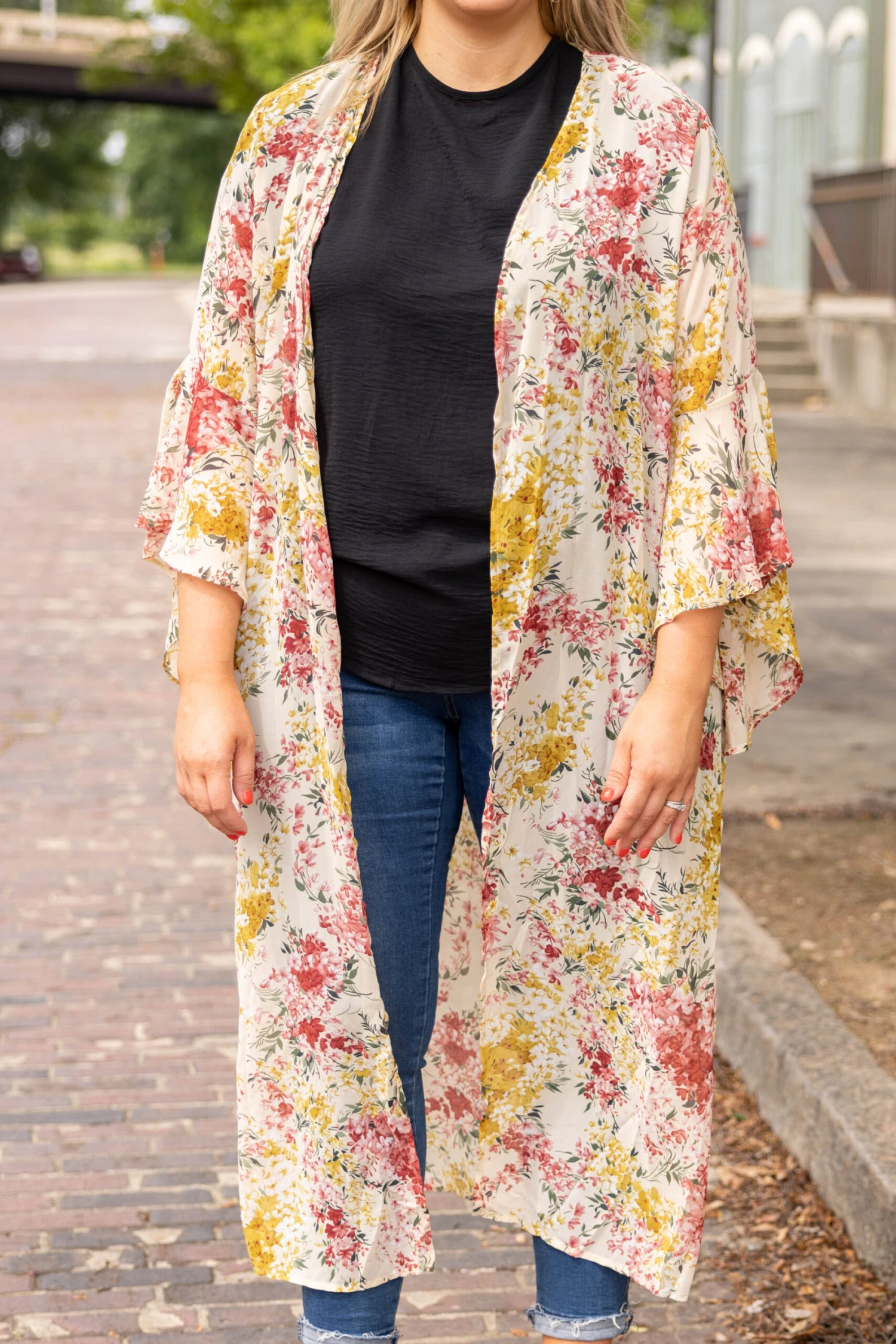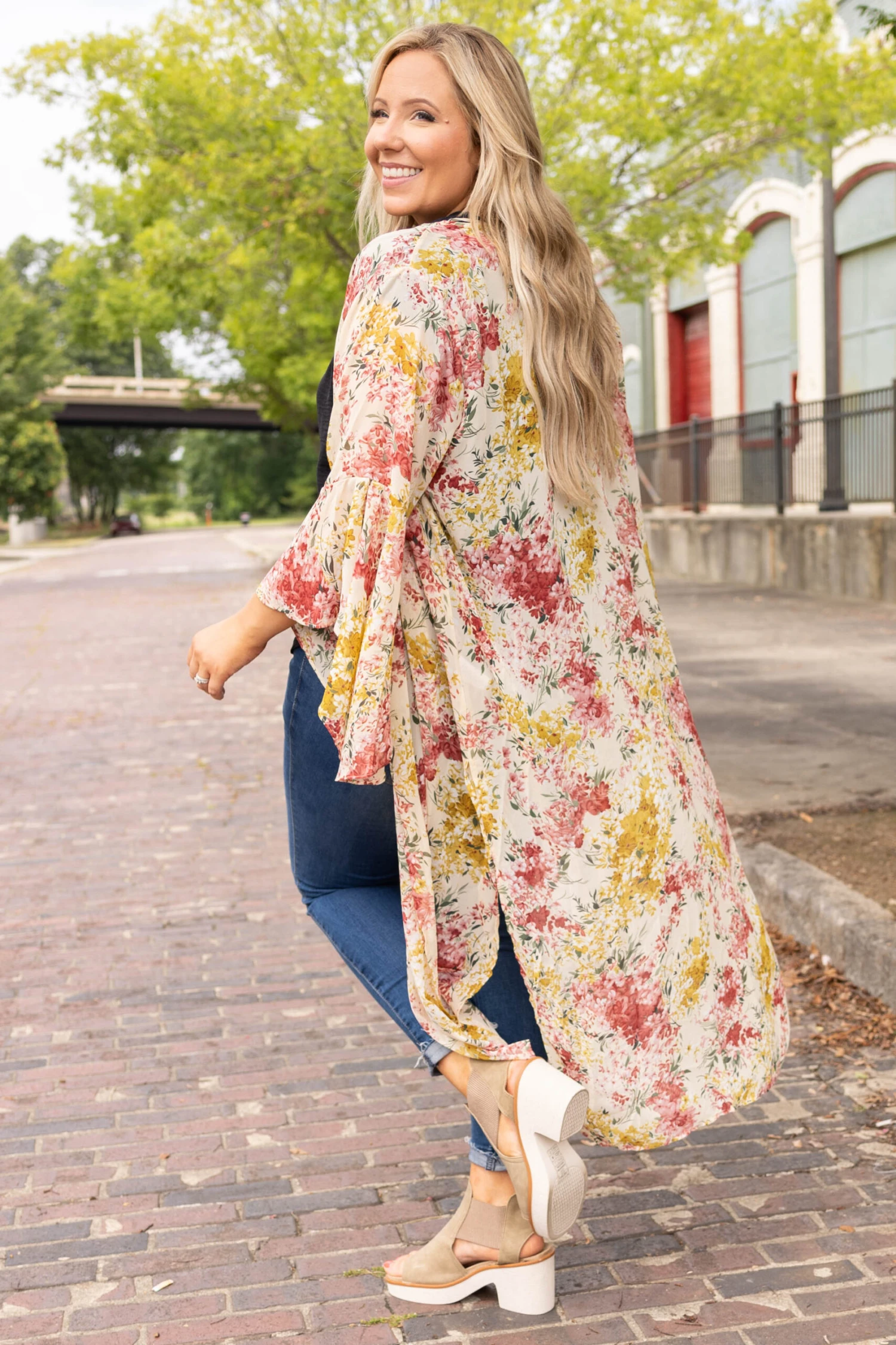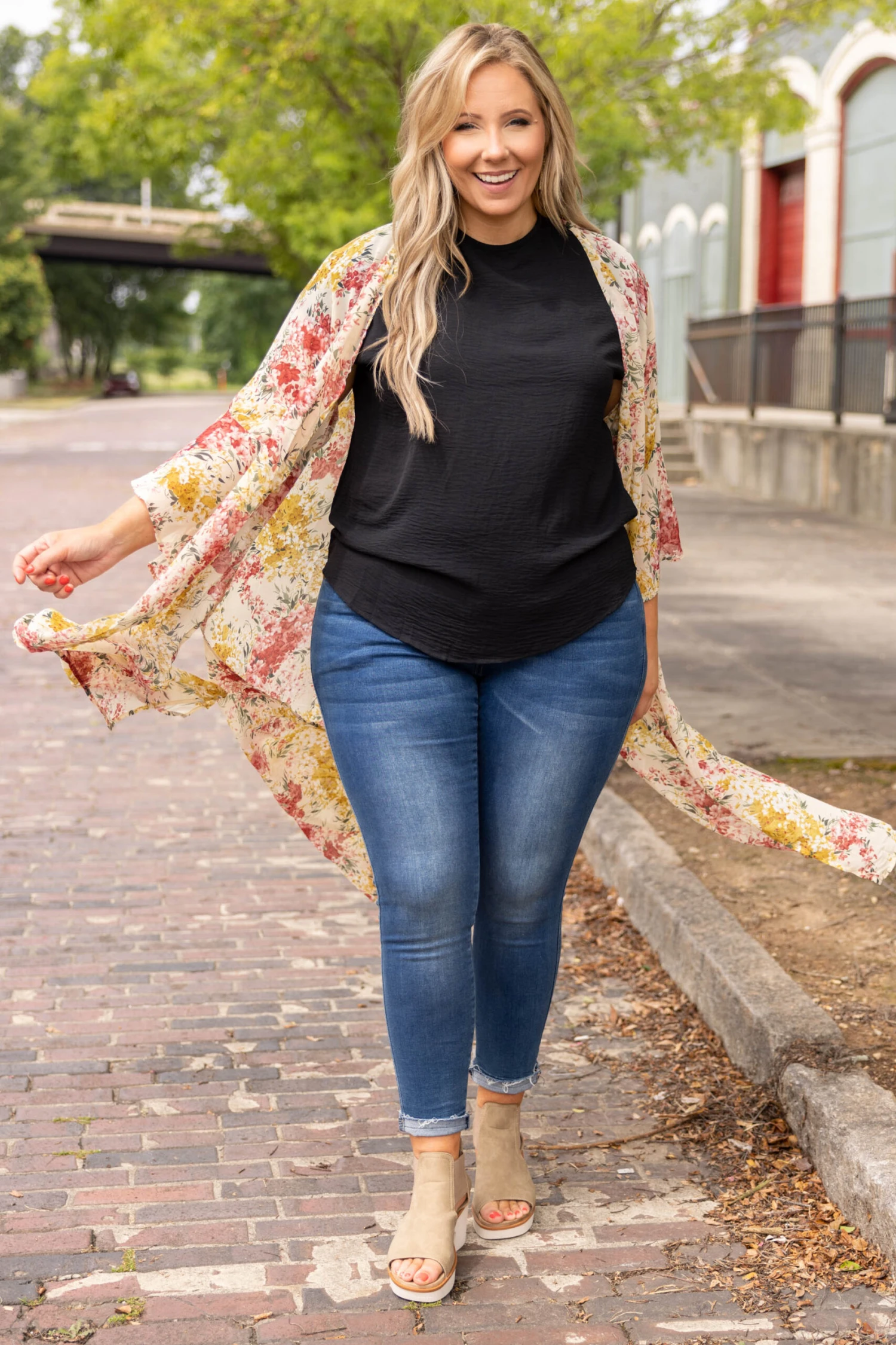 Whether you are working long days or running into town, this kimono is here for you! It features a beautiful floral design that makes styling it a breeze! It is light and airy that makes it comfortable for all-day wear and the fit is super flattering! This kimono can take you from work to date night in a snap! Pair this top with your favorite blouse and skinny jeans for a chic look!