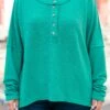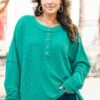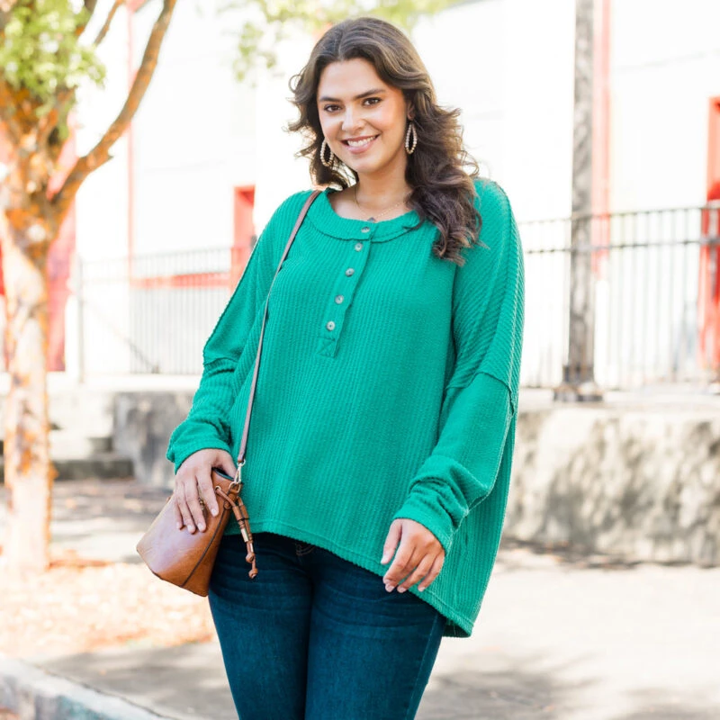 Stay comfortable and stylish with our Working With Friends Tunic in turquoise! This long sleeve ribbed tunic features a unique button up detail and outer stitching along the round neckline! Perfect for a casual day out with friends!