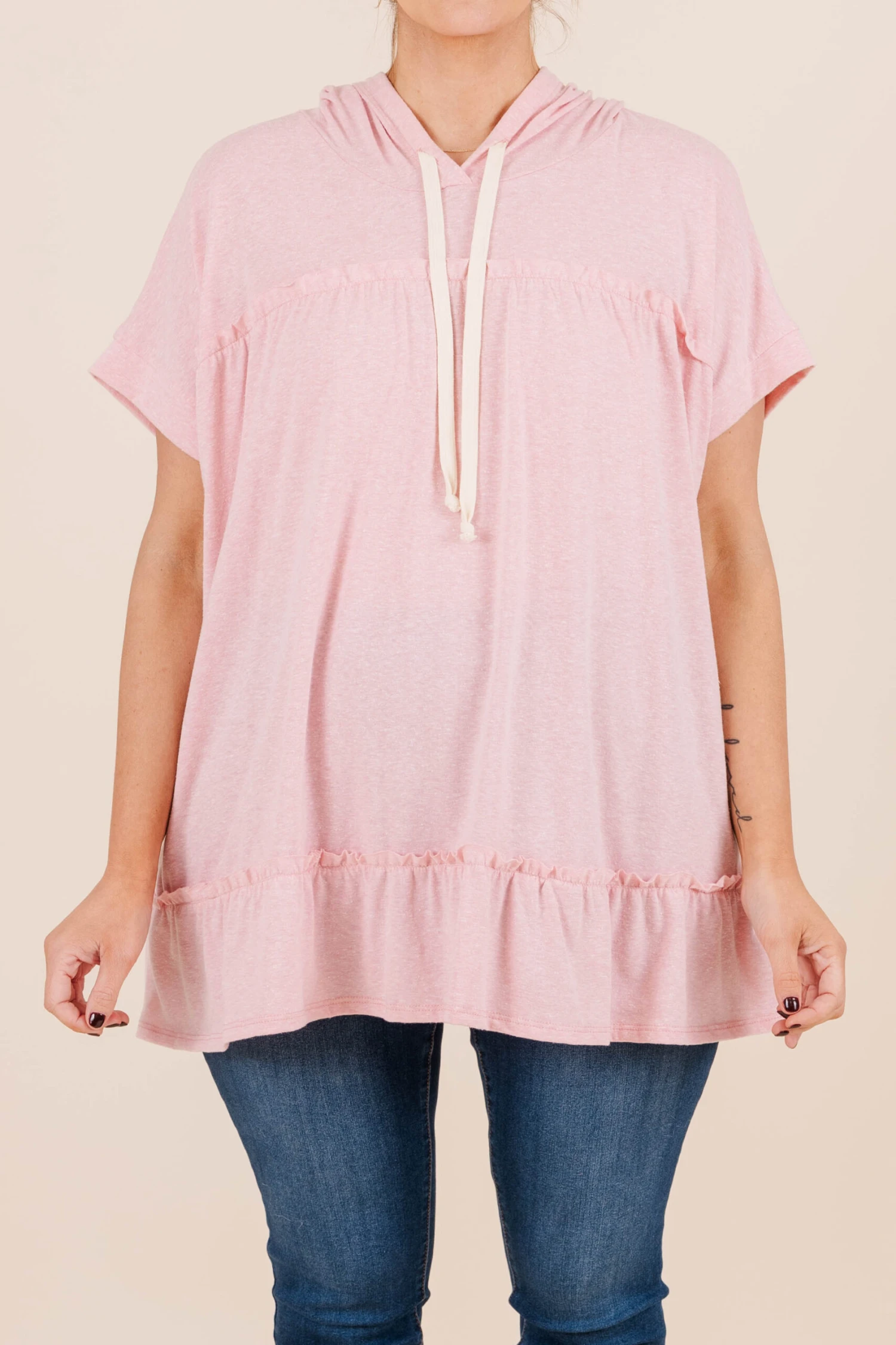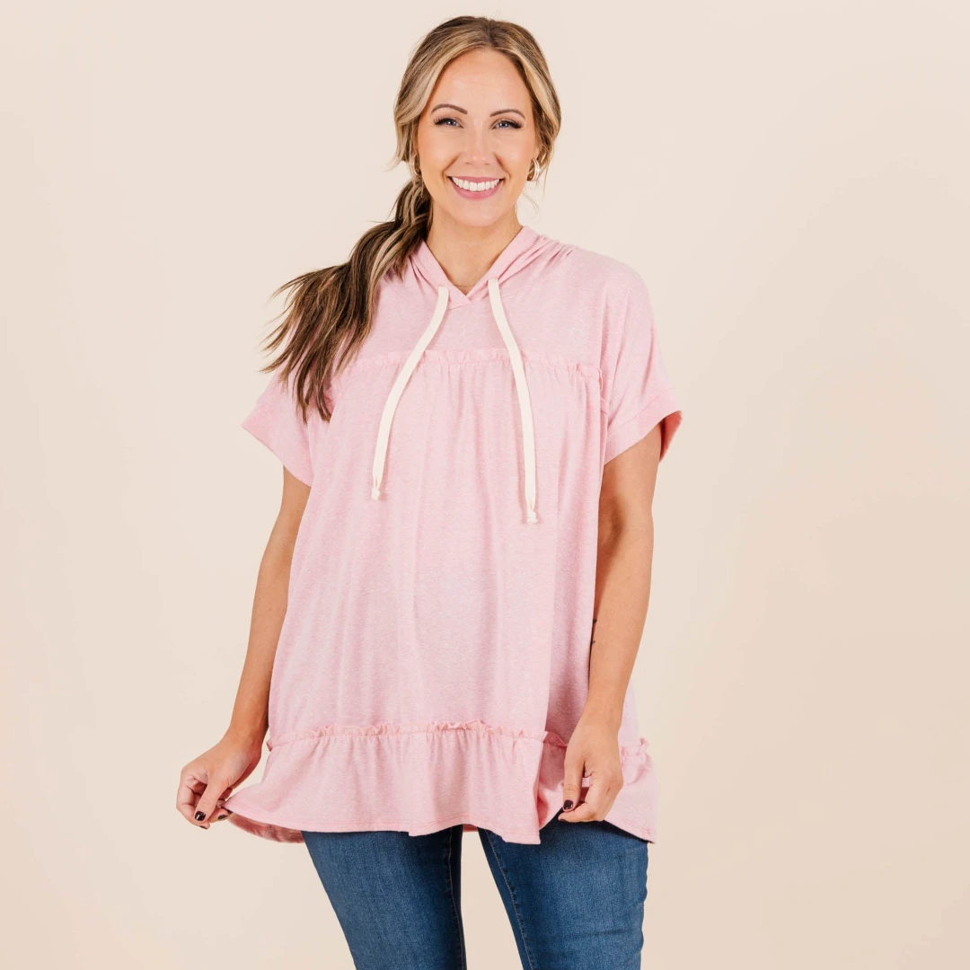 WE are SO in love with this hoodie! It has a gorgeous blush color, perfect for any season! Featuring elegant ruffle detailing and pairing effortlessly with skinnies or leggings for a versatile look!