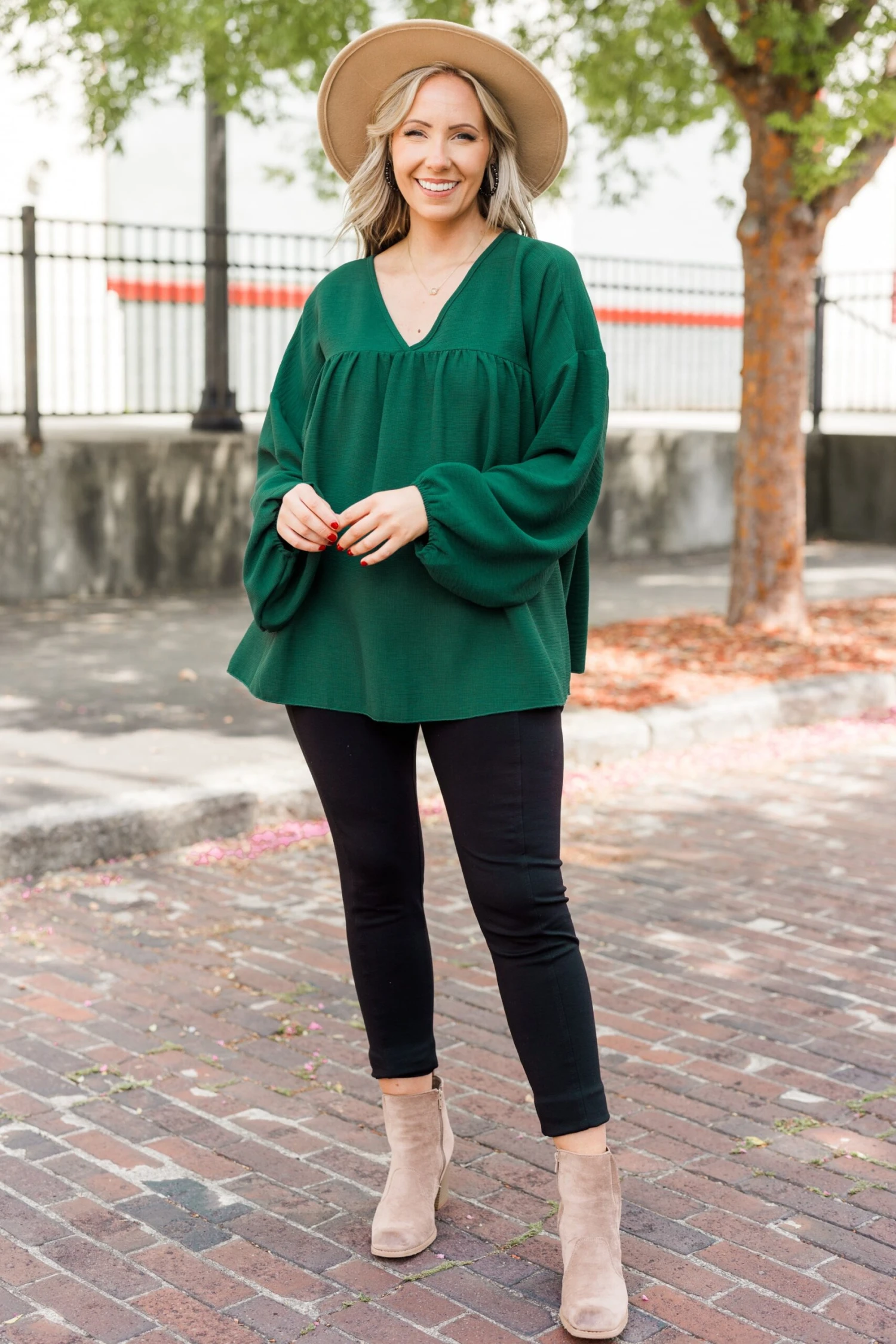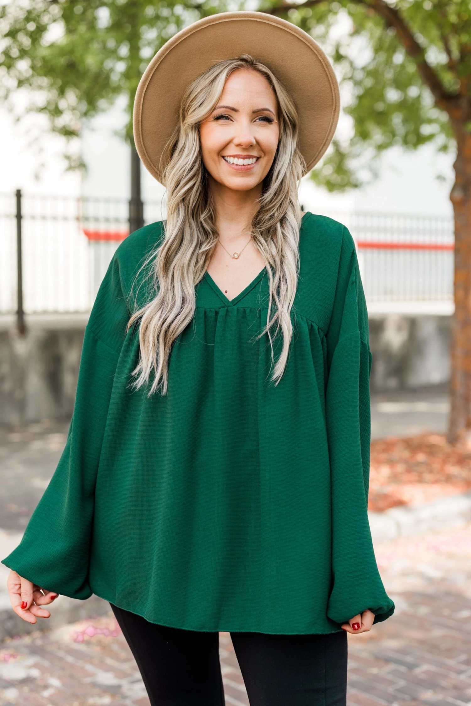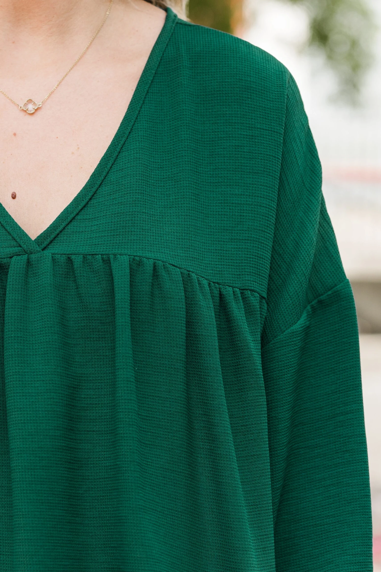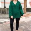 Elevate your style with our Writing My Song Top in hunter green! This long sleeve babydoll top features a flattering v neckline, cuffed bubble sleeves, and a textured fabric for added dimension! Perfect for any occasion, make a statement with this vibrant and stylish piece!