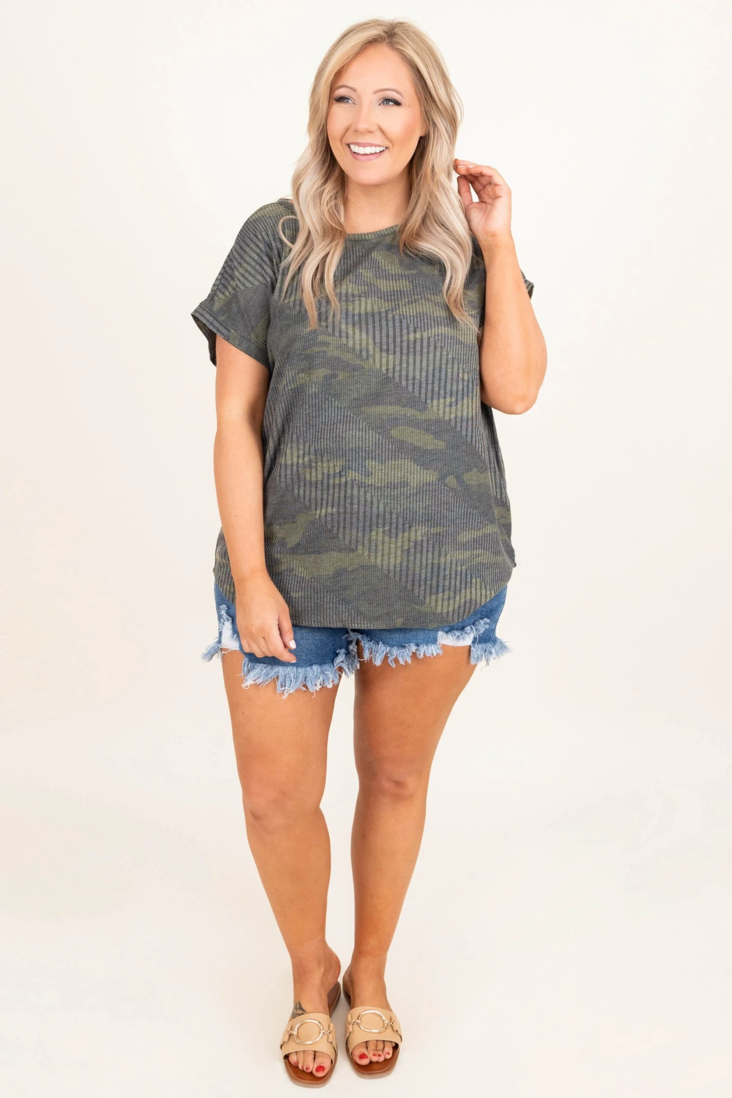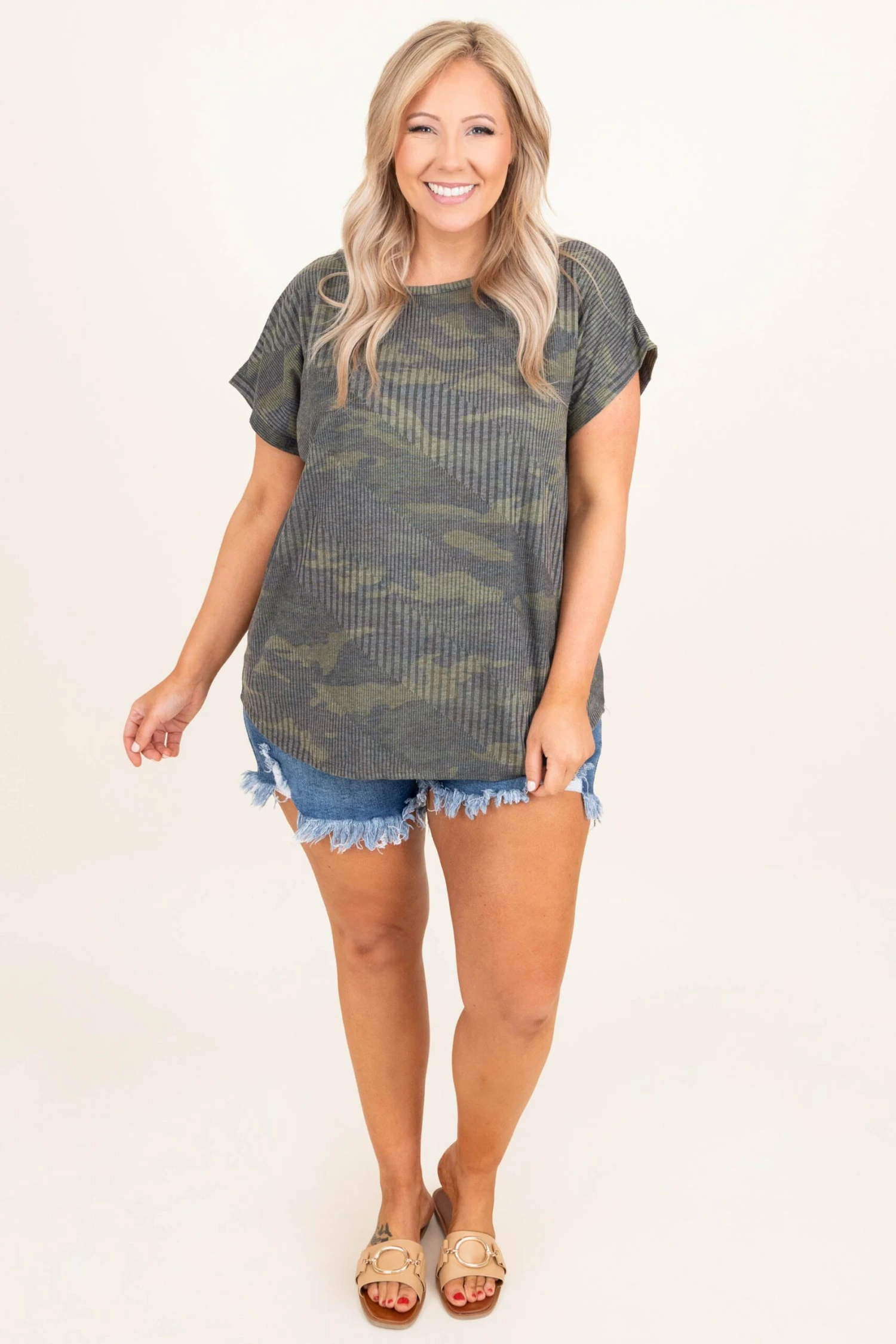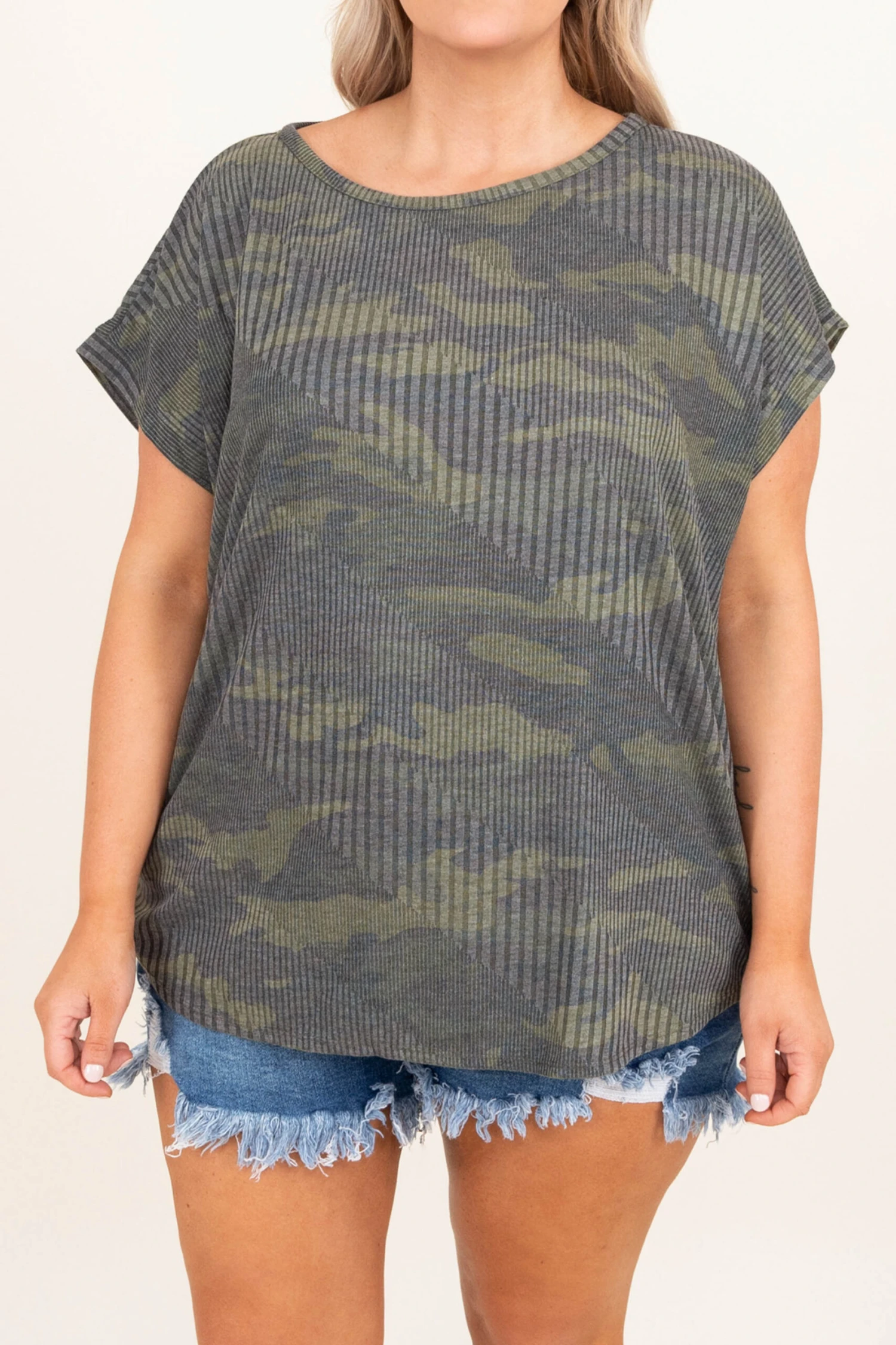 Be fierce and tough in this top! The camo design is super sassy and the ribbed material is super trendy with a subtle diagonal ribbed pattern that is so unique! This is perfect for throwing on with jean shorts and sandals for an easy but chic everyday look!