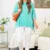 This top can be all yours in a couple clicks! This top in turquoise is made with textured material, a trendy acid wash, and exposed seams, ensuring comfort and stretch for a perfect, casual day out! Pair this cutie with some white denim and heels or sandals for a casual chic look!