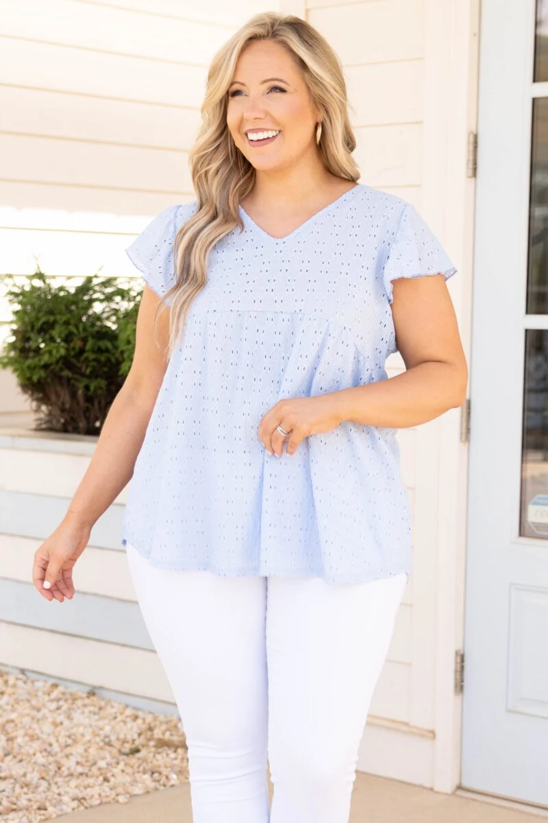 This top is sure to become a favorite! We love the eyelet fabric and soft blue color. With ruffle sleeves and a v-neckline, its perfect for your next brunch outing or date night! Simply pair this cutie with some basic skinnies and sandals for an easy cute look!