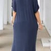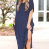 We are in love with this beautiful maxi dress! It has an ink blue color that is so easy to pair with all of your faves! The flowy, figure flattering fit is super comfy and great for all day wear! Style this dress with cute accessories and heels or sandals for the ultimate chic look!